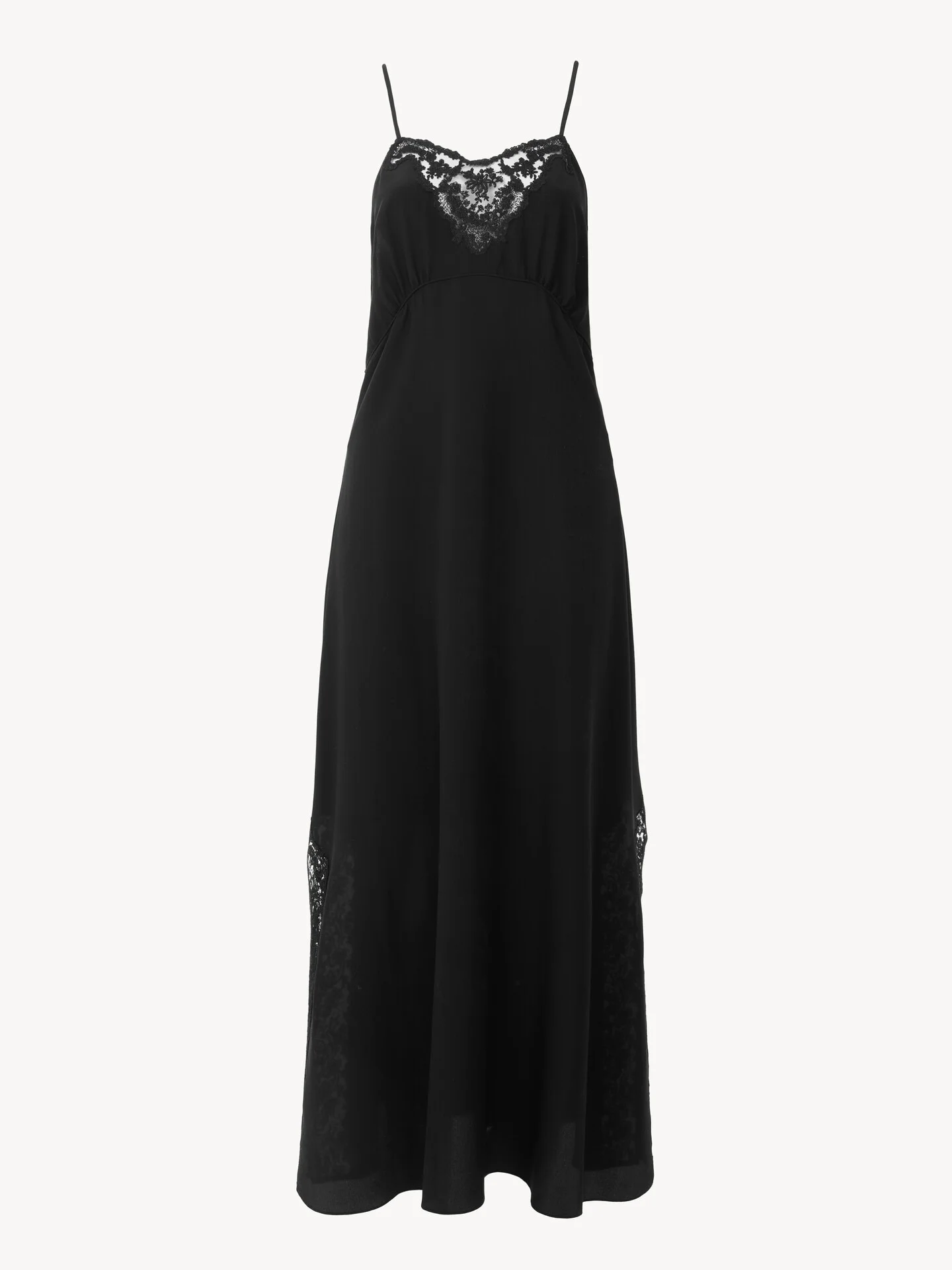 DESCRIPTION Long lingerie dress in organic silk crepe de chine, featuring tonal lace inserts, thin straps and a gathered chest. PRODUCT DETAILS Long lingerie dress outer shell: 100% Silk Lacework: 100% Polyester Fit: fluid, long - The model is 5'10" (178 cm) and wears a prototype in size 36 - Silk lingerie dress - Slips on Organic silk manufacturing restricts the use of pesticides, insecticides or harsh chemicals and incorporates methods that respect biodiversity, improve soil quality and reduce water consumption. This product was made in collaboration with Akanjo, a certified WFTO supplier. Akanjo is a social enterprise located in Madagascar that places equal pay and employees' health & wellbeing at the core of their priorities. A long-standing partner of Chloe for 15 years, Akanjo is also committed to training and promoting craftsmanship. Color: Black Item code: CH26UR137005001 CARE INSTRUCTIONS To preserve the integrity of your garment, please refrain from washing, entrusting its care to professional cleaning services for optimal maintenance. This garment cannot withstand any bleaching agent. To maintain its shape, gently iron this garment at a maximum sole plate temperature of 110°C, taking care to avoid any harsh pressure while ironing. Entrust this garment to a specialist for mild cleaning with tetrachloroethylene and solvent F, ensuring its delicate nature is maintained with the most care. To best preserve its form and texture, please do not tumble dry this garment. To maintain its delicate nature, do not wet clean this garment. TRACEABILITY Better traceability is central to improving our materials as well as social and environmental practices. Dyeing: Italy Finishing: Italy Weaving: Italy