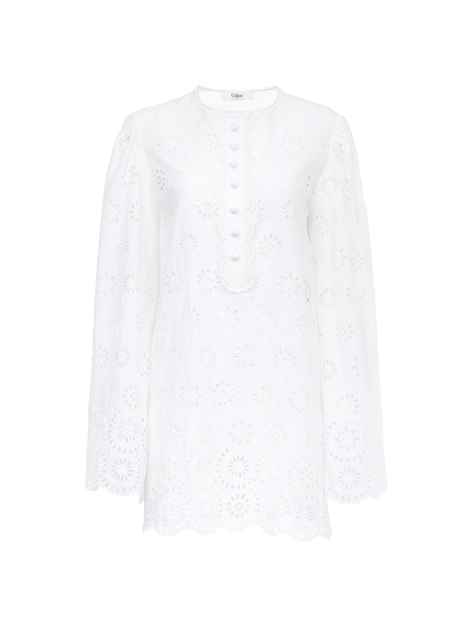 Round-neck long-sleeve mini dress in cotton voile with floral broderie anglaise and a separate cotton lining, detailed with fabric-covered buttons at the front. PRODUCT DETAILS Long-sleeve mini dress outer shell: 90% Cotton, 10% Polyester Separate lining: 100% Cotton Button placket: 96% Cotton, 4% Polyester Fit: straight, mini length - The model is 5'10" (178 cm) and wears a prototype in size 36 - Embroidered cotton mini dress - Fabric-covered buttons at front Color: Iconic Milk Item code: CH25ARO44699107
