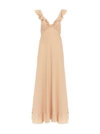 Long sun dress in organic silk crepe de chine with a fluid, V-neck silhouette, featuring ruffles, gathered details and fabric-covered buttons. PRODUCT DETAILS Long sun dress outer shell: 100% Silk Fit: long, fluid - The model is 5'10" (178 cm) and wears a prototype in size 36 - Sleeveless silk dress - Side zipper - Fabric-covered buttons Care: dry cleaning only Organic silk manufacturing restricts the use of pesticides, insecticides or harsh chemicals and incorporates methods that respect biodiversity, improve soil quality and reduce water consumption. This product was made in collaboration with Akanjo, a certified WFTO supplier. Akanjo is a social enterprise located in Madagascar that places equal pay and employees' health & wellbeing at the core of their priorities. A long-standing partner of Chloe for 15 years, Akanjo is also committed to training and promoting craftsmanship. Color: Sand Brown Item code: CH25SRO29125285