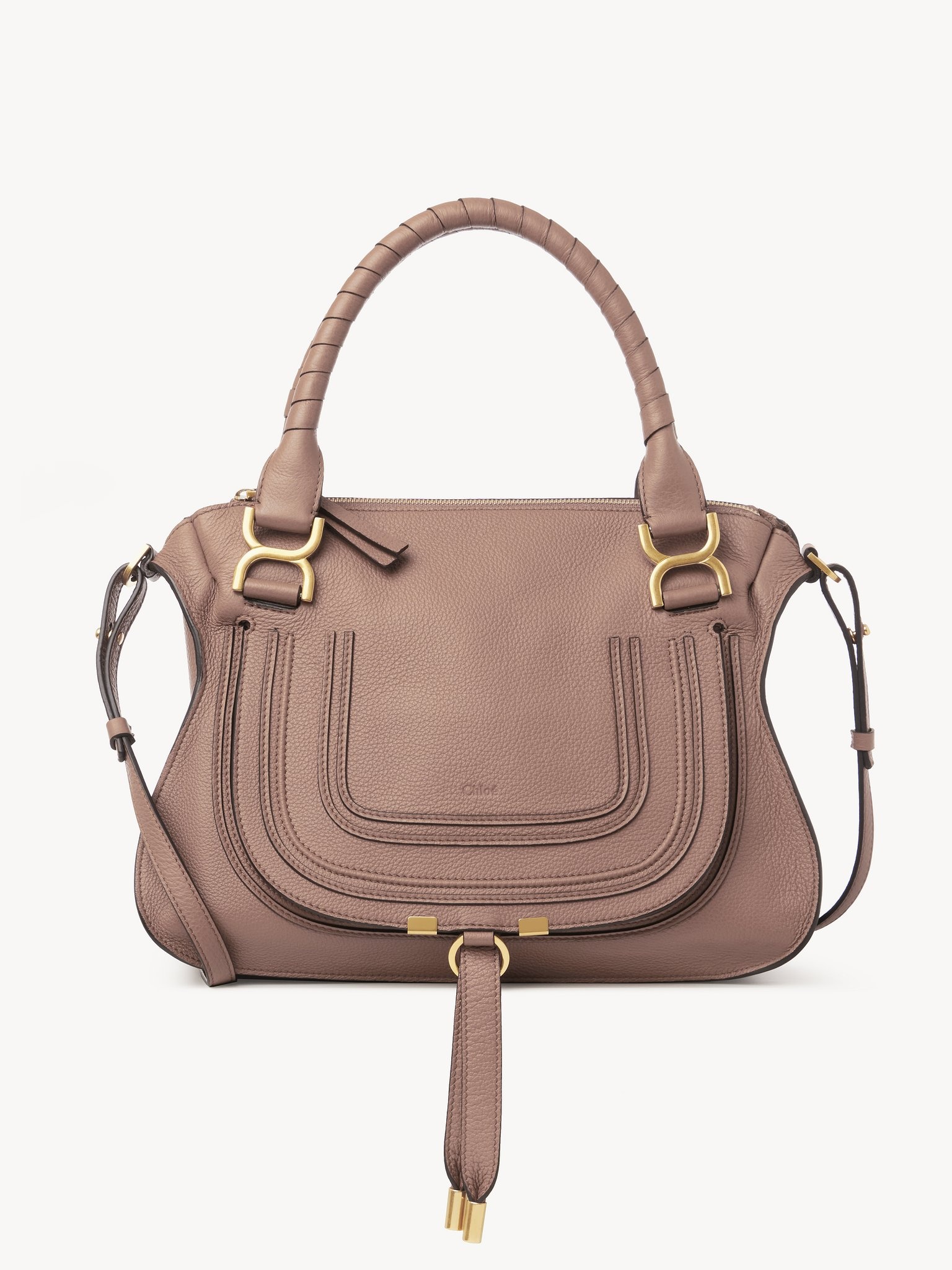 Crafted from grained calfskin, this Marcie purse has a slouchy silhouette with feminine lines. It is finished with saddle stitching, iconic gold-tone buckles and hand-wrapped double handles. The line's dangling leather tassels secure the flap. Carry this leather bag in the hand, on the shoulder or crossbody with the handles or strap. PRODUCT DETAILS Handbag in grained calfskin Main material: Calfskin Main lining: 68% Linen, 32% Cotton Flap lining: Calfskin Carry: Hand, shoulder & crossbody - 1 Roomy compartment - 1 Front slip pocket hidden by the flap - 1 Internal zipped pocket - Removable leather strap - Zipped closure Comes with a dust bag - Width: 14.2" (36 cm) - Height: 11" (28 cm) - Depth: 4.7" (12 cm) - Min. strap drop: 18.5" (47 cm) - Max. strap drop: 20.5" (52 cm) To make this product, Chloe worked with Leather Working Group (LWG) certified leather manufacturers. LWG certifies tanneries based on their water and energy usage, management of chemicals, solid waste, and wastewater. Color: Woodrose Item code: CHC22AS660I31527