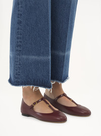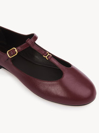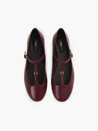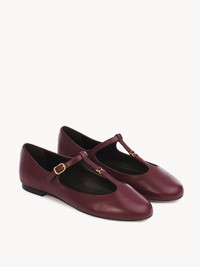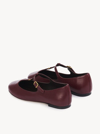 Crafted from nappa goatskin, this revisited Marcie ballerina pairs a Mary Jane silhouette with an almond toe shape for a Parisian attitude. The upper is detailed with Marcie's gold-tone hardware in miniature while the Chloe-engraved buckle lends a signature finish to these comfortable ballet flats. PRODUCT DETAILS Flat ballerina Upper: goatskin Inner sole: sheepskin Main lining: sheepskin Sole: cowhide Fit true to size, European sizing - Buckle fastening To make this product, Chloe worked with Leather Working Group (LWG) certified leather manufacturers. LWG certifies tanneries based on their water and energy usage, management of chemicals, solid waste, and wastewater. Color: Deep Ruby Item code: CHC24A02NNP6BC