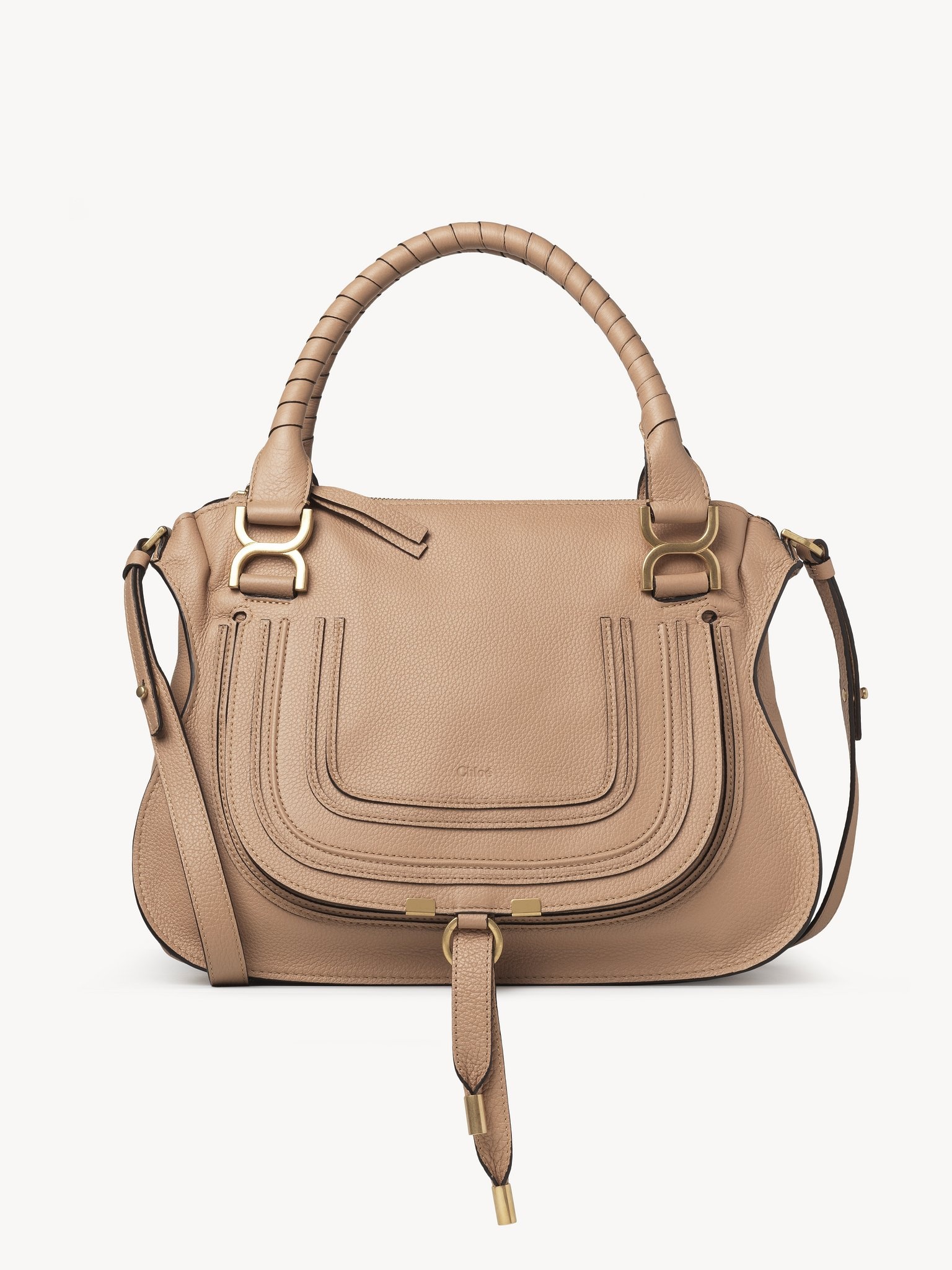 This iconic Marcie double carry bag is a roomy and practical day bag crafted from grained calfskin. Clean lines and a contoured design enhance the slouchy silhouette, while hand-wrapped leather handles add crafty detail. The detachable strap allows for casual, cross-body styling. All about Marcie... The Maison’s Marcie bag line blends a feminine aesthetic with a 70s folk spirit. Decorative saddle stitches create equestrian appeal, while the glint of brass hardware and the dangling tassel add a feminine touch. PRODUCT DETAILS Double carry bag in grained calfskin Carry: hand & long shoulder or cross-body - 1 Roomy compartment - 1 Front slip pocket hidden by the flap - 1 Internal zippered pocket - Removable leather strap - Antique gold finishing - Linen lining Comes with a dust bag - Width: 14.2" (36 cm) - Height: 11.0" (28 cm) - Depth: 4.7" (12 cm) - Min. strap drop: 18.1" (46 cm) - Max. strap drop: 21.6" (55 cm) This double carry bag is made from semi-aniline leather. Tanning imparts a specific character to the skin, such as hues and wrinkles, combined with a light and transparent aniline finish. Respect the care instructions on the leaflet. To make this product, Chloé worked with Leather Working Group (LWG) certified leather manufacturers. LWG certifies tanneries based on their water and energy usage, management of chemicals, solid waste, and wastewater. Color: Light Tan Item code: CHC22AS660I3126X