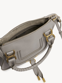 A more compact version of the iconic Marcie handbag, this small purse is crafted from grained calfskin. Clean lines and a contoured design enhance the slouchy silhouette, while hand-wrapped leather handles add crafty detail. The X-shaped buckles lend a refined finish. Double handles and a long, removable shoulder strap make this small double carry bag a truly versatile accessory. All about Marcie... The Maison’s Marcie bag line blends a feminine aesthetic with a 70s folk spirit. Decorative saddle stitches create equestrian appeal, while the glint of brass hardware and the dangling tassel add a feminine touch. PRODUCT DETAILS Small double carry bag in grained calfskin Carry: long shoulder, cross-body & hand - Roomy compartment - Zippered closure - Front slip pocket hidden by the flap - 1 internal zippered pocket - Removable leather strap attached with hooks - Linen lining Comes with a dust bag - Width: 11.8” (30 cm) - Height: 9" (23 cm) - Depth: 3.5" (9 cm) - Wide strap length: 20.1" (51 cm) This small double carry bag is made from semi-aniline leather. The half-transparent finish imparts a robust nature to the product while preserving its natural character. Respect care instructions on the leaflet. To make this product, Chloe worked with Leather Working Group (LWG) certified leather manufacturers. LWG certifies tanneries based on their water and energy usage, management of chemicals, solid waste, and wastewater. Color: Cashmere Gray Item code: CHC22AS628I31053