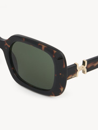 These Marcie rectangular sunglasses pair a Havana beveled frame in lower-impact acetate with solid green lenses. The line's signature gold metal piece details the temples. Drop-shaped openings at the temple tips make these sunglasses compatible with Chloe's eyewear jewelry. PRODUCT DETAILS Rectangular sunglasses in lower-impact acetate & bio-based nylon - 100% UVA and UVB protection - Not prescription friendly - Chloe-engraved metal piece on the temples - Filter category: 4 These sunglasses come with a case and lens cloth - Lens: 2.1" (53 mm) - Bridge: 0.9" (22 mm) - Temple: 5.6" (142 mm) - Havana lower-impact acetate frame - Solid green lenses Item code: CH25WEK0333219