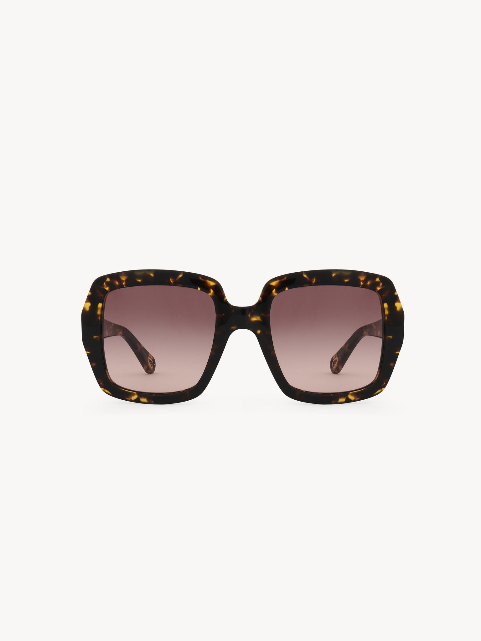 These Marcie square sunglasses pair a Havana frame in lower-impact acetate with gradient burgundy and rose lenses. The line's signature gold metal piece details the temples. Drop-shaped openings at the temple tips make these sunglasses compatible with Chloe's eyewear jewelry. PRODUCT DETAILS Square sunglasses in lower-impact acetate & bio-based nylon - 100% UVA and UVB protection - Not prescription friendly - Chloe-engraved metal piece - Filter category: 2 These sunglasses come with a case and lens cloth - Lens: 2" (52 mm) - Bridge: 0.9" (22 mm) - Temple: 5.5" (140 mm) - Havana/Honey lower-impact acetate frame - Gradient burgundy & rose lenses Item code: CHC25SEK0301846