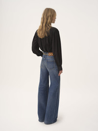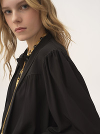 Maxi gathered lavalliere blouse in organic silk crepe de chine with a fluid silhouette. PRODUCT DETAILS Lavalliere blouse outer shell: 100% Silk Buttons: 100% Mother-of-pearl Fit: maxi - The model is 5'10" (178 cm) and wears a prototype in size 36 - Fluid silk blouse - Lavalliere scarf - Mother-of-pearl buttons through front & at cuffs Organic silk manufacturing restricts the use of pesticides, insecticides or harsh chemicals and incorporates methods that respect biodiversity, improve soil quality and reduce water consumption. This product was made in collaboration with Akanjo, a certified WFTO supplier. Akanjo is a social enterprise located in Madagascar that places equal pay and employees' health & wellbeing at the core of their priorities. A long-standing partner of Chloe for 15 years, Akanjo is also committed to training and promoting craftsmanship. Color: Black Item code: CH25AHT19077001