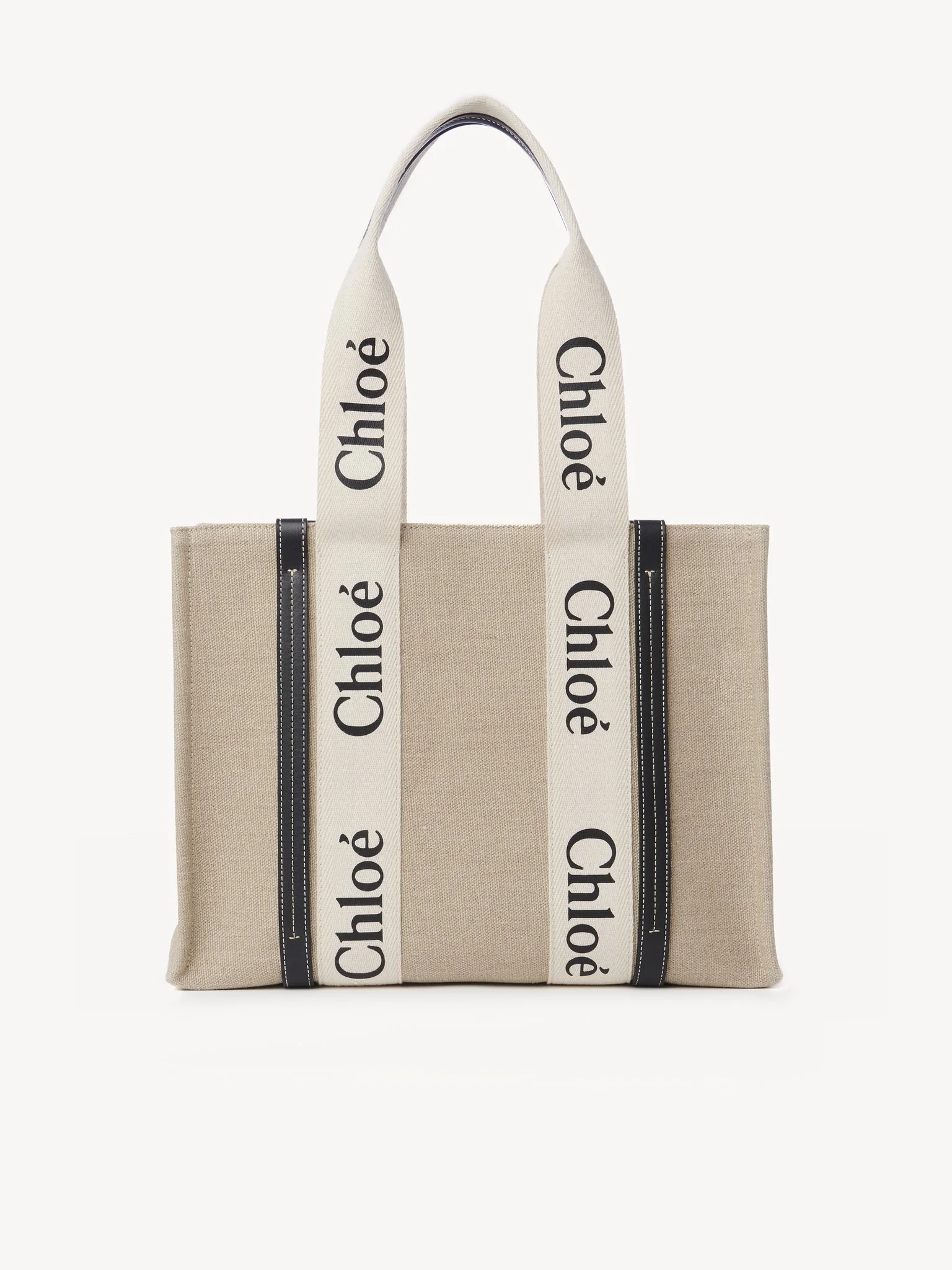 Crafted from lower-impact linen canvas detailed with shiny calfskin strips, this medium Woody tote bag is a spacious bag with a strong summer attitude. The roomy inside compartment includes a practical flat pocket. The bag's sharp, modern lines are emphasized by the contrasting vertical leather strips and the signature Chloé logo ribbon in lower-impact linen, carried over from the Maison's Woody mule. Carry this tote bag comfortably on the shoulder. PRODUCT DETAILS Tote bag in linen canvas & shiny calfskin with Woody ribbon Carry: short shoulder & hand - 2 long handles - 1 spacious main compartment - 1 internal flat pocket Comes with a dust bag - Width: 14.6" (37 cm) - Height: 10.2" (26 cm) - Depth: 4.7" (12 cm) - Strap drop: 9.8" (25 cm) This handbag is made from linen. In an effort to limit its environmental impact and have a positive influence on society, Chloé is accelerating its transition to more responsible sourcing. This progress is most notably reflected in the introduction of linen—an inherently lower-impact material—to the collection. Respect care instructions on the leaflet. By purchasing this product, you are supporting sustainable leather manufacturing through the Leather Working Group. Color: White & Blue Item code: CHC22AS383I2691J