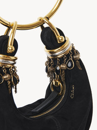 Inspired by the Maison's Archives, this mini Bracelet Hobo bag is crafted from suede goatskin with a supple, rounded shape elevated by a bracelet handle. Stacked bi-color rings and dangling beads add jewelry embellishment. Carry the mini Bracelet bag in the hand, on the shoulder or crossbody. PRODUCT DETAILS Mini Bracelet Hobo bag in suede goatskin with beads Main material: Goatskin Secondary material: Calfskin Main lining: Lambskin Carry: Hand, shoulder & crossbody - 1 main compartment - 1 inside flat pocket - 1 removable ring handle - 1 adjustable & removable strap - Zip closure Comes with a dust bag - Width: 8.3" (21 cm) - Height: 5.5" (14 cm) - Depth: 2.4" (6 cm) - Handle drop: 8.7" (22 cm) - Min. strap drop: 16.5" (42 cm) - Max. strap drop: 19.7" (50 cm) To make this product, Chloe worked with Leather Working Group (LWG) certified leather manufacturers. LWG certifies tanneries based on their water and energy usage, management of chemicals, solid waste, and wastewater. Color: Black Item code: CH25AS623Q06001