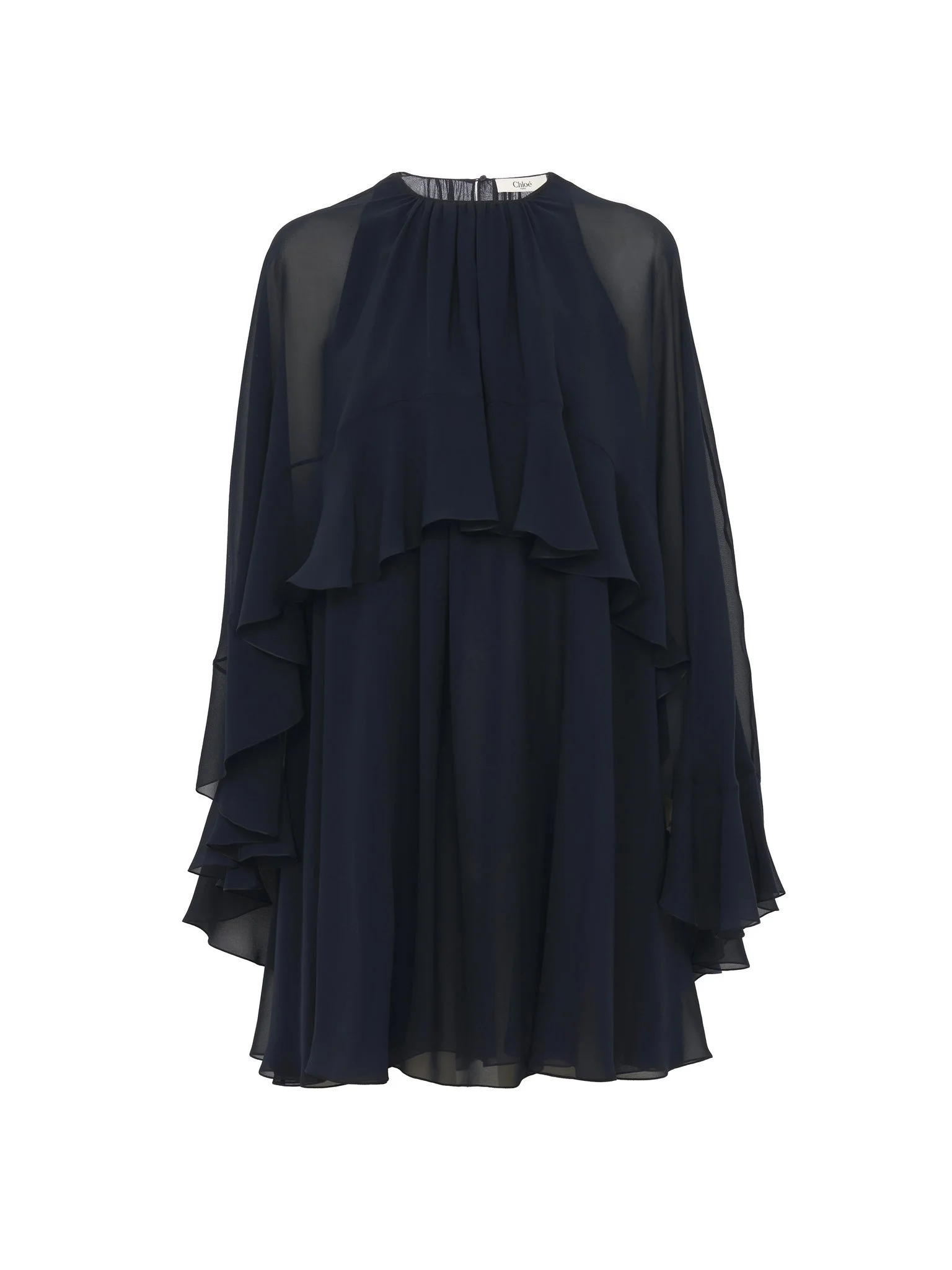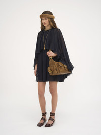 Fluid mini cape dress in organic silk georgette, combining a separate sleeveless dress lining with a removable cape and ruffles. PRODUCT DETAILS Short cape dress outer shell: 100% Silk Lining: 68% Acetate fiber, 32% Silk Removable cape: 100% Silk Button: 100% Mother-of-pearl Fit: fluid, mini length - The model is 5’10” (178 cm) and wears a prototype in size 36 - Short silk dress - Mother-of-pearl button - Sleeveless dress lining with American armholes Care: dry cleaning only Organic silk manufacturing restricts the use of pesticides, insecticides or harsh chemicals and incorporates methods that respect biodiversity, improve soil quality and reduce water consumption. This product was made in collaboration with Akanjo, a certified WFTO supplier. Akanjo is a social enterprise located in Madagascar that places equal pay and employees' health & wellbeing at the core of their priorities. A long-standing partner of Chloe for 15 years, Akanjo is also committed to training and promoting craftsmanship. Color: Graphite Blue Item code: CH24WRO5512348Q