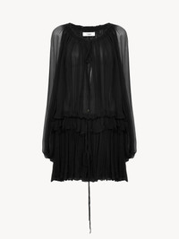 DESCRIPTION Mini cape dress in iconic organic silk mousseline with a gathered silhouette, ruffles and drawstring ties finished with gold-tone metal tips. PRODUCT DETAILS Mini cape dress outer shell: 100% Silk Lining: 90% Acetate fiber, 10% Silk Fit: fluid, mini length - The model is 5’10” (178 cm) and wears a prototype in size 36 - Mini silk dress - Back zipper - Drawstring neck & waist with hammered metal tips - Separate lining Organic silk manufacturing restricts the use of pesticides, insecticides or harsh chemicals and incorporates methods that respect biodiversity, improve soil quality and reduce water consumption. This product was made in collaboration with Akanjo, a certified WFTO supplier. Akanjo is a social enterprise located in Madagascar that places equal pay and employees' health & wellbeing at the core of their priorities. A long-standing partner of Chloe for 15 years, Akanjo is also committed to training and promoting craftsmanship. Color: Black Item code: CH26SRO02001001 CARE INSTRUCTIONS To preserve the integrity of your garment, please refrain from washing, entrusting its care to professional cleaning services for optimal maintenance. This garment cannot withstand any bleaching agent. To maintain its shape, gently iron this garment at a maximum sole plate temperature of 110°C, taking care to avoid any harsh pressure while ironing. Entrust this garment to a specialist for mild cleaning with tetrachloroethylene and solvent F, ensuring its delicate nature is maintained with the most care. To best preserve its form and texture, please do not tumble dry this garment. To maintain its delicate nature, do not wet clean this garment. TRACEABILITY Better traceability is central to improving our materials as well as social and environmental practices. Dyeing: France Finishing: France Weaving: France