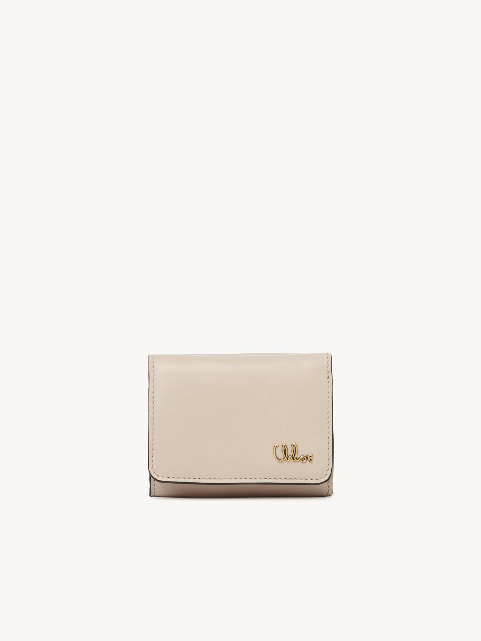 Crafted from shiny calfskin, the mini Chloe Iconic tri-fold wallet combines a minimalist design with a metallic signature from the Maison's archives. Sized to slip easily into a clutch or small bag, this compact wallet features a bill compartment and multiple pockets. PRODUCT DETAILS Mini tri-fold wallet in shiny calfskin Main lining: Calfskin Inner lining: 65% Polyester, 35% Cotton - 1 back pocket with flap - 1 bill compartment - 3 flat pockets - Snap button closure Comes with a dust bag - Width: 3.9" (10 cm) - Height: 2.8" (7 cm) - Depth: 1.2" (3 cm) This tri-fold wallet is made from natural leather with a very light finish. Keep away from water (rain). The wallet may develop smooth or light halos. If the leather gets wet, dry it with a soft white cloth to absorb water. With use, the leather may become marked. To make this product, Chloe worked with Leather Working Group (LWG) certified leather manufacturers. LWG certifies tanneries based on their water and energy usage, management of chemicals, solid waste, and wastewater. Color: Cement Pink Item code: CH25SP487O166J5