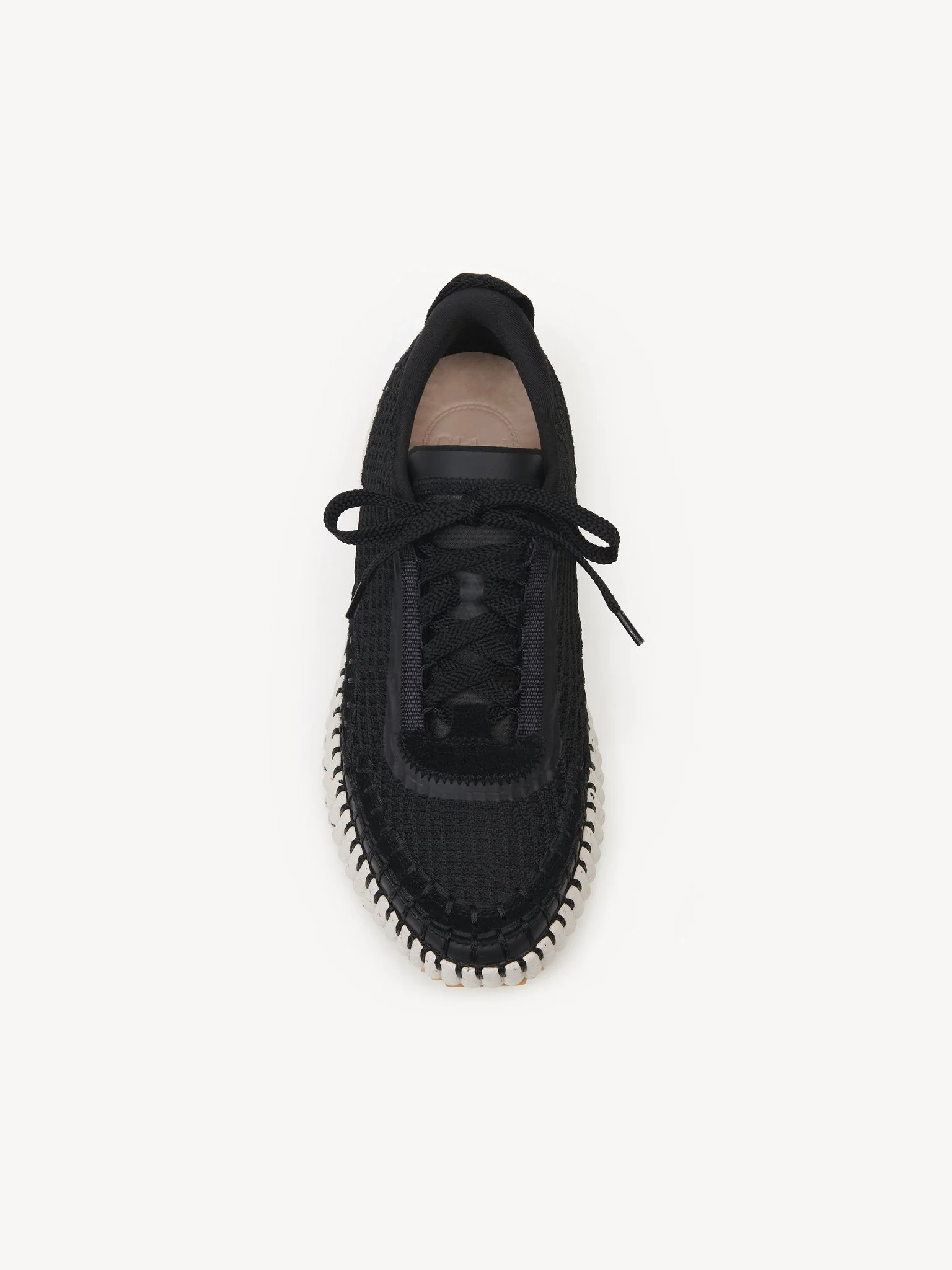 Rooted in the Maison's commitment to sustainability, the eco-designed Nama sneaker is crafted from a rich mix of materials with 40% of its weight made up of recycled debris. The bold, lightweight structure features a hand-stitched mesh upper, showcasing authentic Chloé craftsmanship. Set on a contrasting, ridged sole, this unisex sneaker is ultra-comfortable with a cool, sporty aesthetic. The Chloé logo at the back adds a signature touch. PRODUCT DETAILS Sneaker heel height: 2" (5 cm) Heel-to-toe drop: 0.8” (2 cm) Upper: All webbings in 100% recycled nylon, 100% recycled polyester and 100% recycled cotton Laces: 100% recycled polyester Knit: 90% recycled polyester yarns Suede skin Heat press: 40% recycled TPU Microsuede: 65% recycled Transparent Mesh: 100% recycled nylon Sole: Sole is assembled using water-based glue, which uses fewer chemicals than solvent-based glue Welt: 20% recycled TPE Midsole: 20% recycled EVA Downsole: 20% recycled rubber Internal Components: Lining: 70% recycled polyester Foam: 80% recycled PU Footbed lining in calfskin Footbed: 30% recycled EVA Fit true to size, European sizing - Lace-up By purchasing this product, you are supporting sustainable leather manufacturing through the Leather Working Group. Color: Black Item code: CHC22S579Y0001