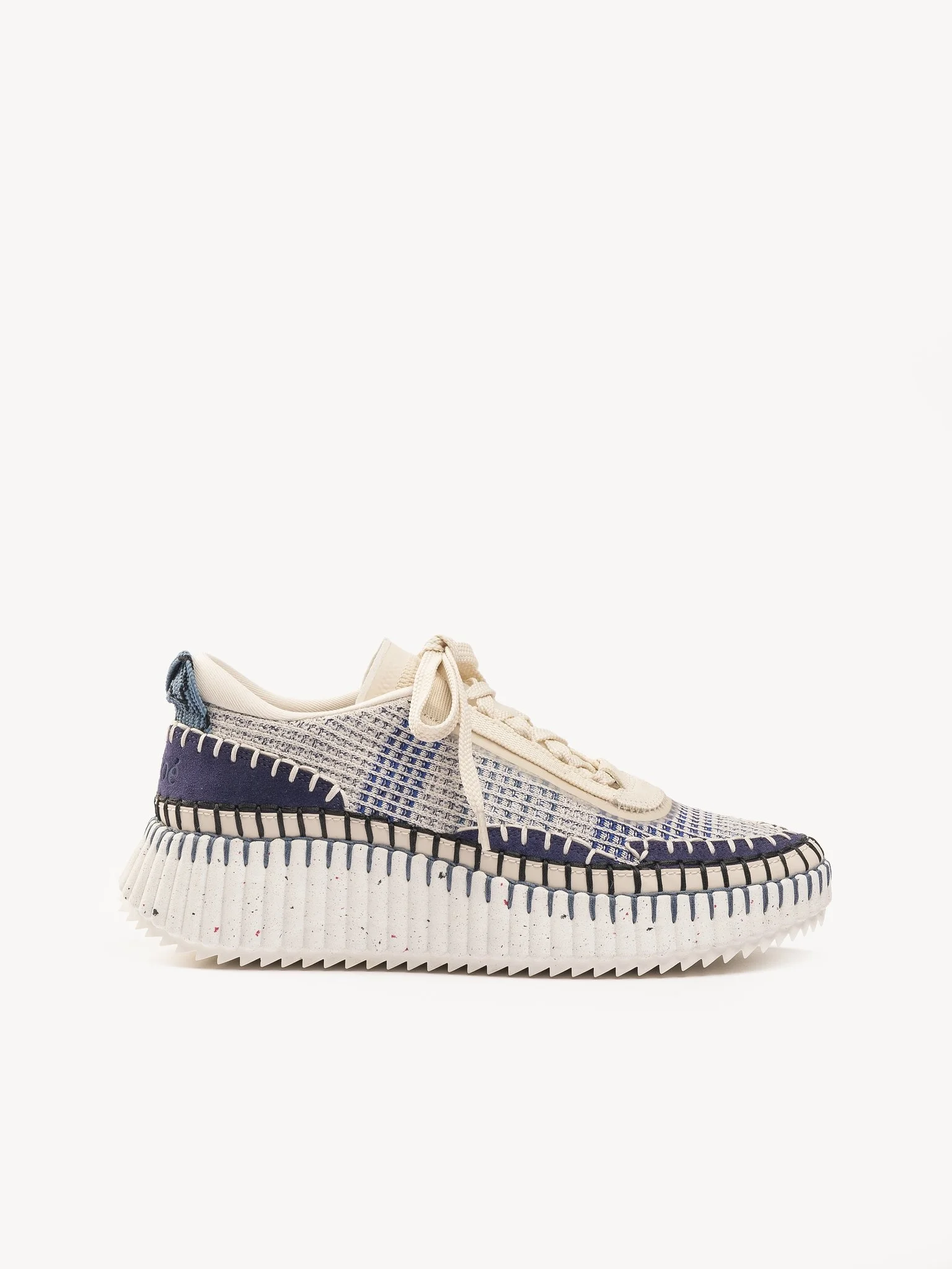 Rooted in the Maison's commitment to sustainability, the eco-designed Nama sneaker is crafted from a rich mix of materials with 40% of its weight made up of recycled debris. The bold, lightweight structure features a hand-stitched mesh upper, showcasing authentic Chloé craftsmanship. Set on a contrasting, ridged sole, this unisex sneaker is ultra-comfortable with a cool, sporty aesthetic. The Chloé logo at the back adds a signature touch. PRODUCT DETAILS Sneaker heel height: 2" (5 cm) Heel-to-toe drop: 0.8” (2 cm) Upper: All webbings in 100% recycled nylon, 100% recycled polyester and 100% recycled cotton Laces: 100% recycled polyester Knit: 90% recycled polyester yarns Suede skin Heat press: 40% recycled TPU Microsuede: 65% recycled Transparent Mesh: 100% recycled nylon Sole: Sole is assembled using water-based glue, which uses fewer chemicals than solvent-based glue Welt: 20% recycled TPE Midsole: 20% recycled EVA Downsole: 20% recycled rubber Internal Components: Lining: 70% recycled polyester Foam: 80% recycled PU Footbed lining in calfskin Footbed: 30% recycled EVA Fit true to size, European sizing - Lace-up By purchasing this product, you are supporting sustainable leather manufacturing through the Leather Working Group. Color: Cosmic Blue Item code: CHC22S579Y0411
