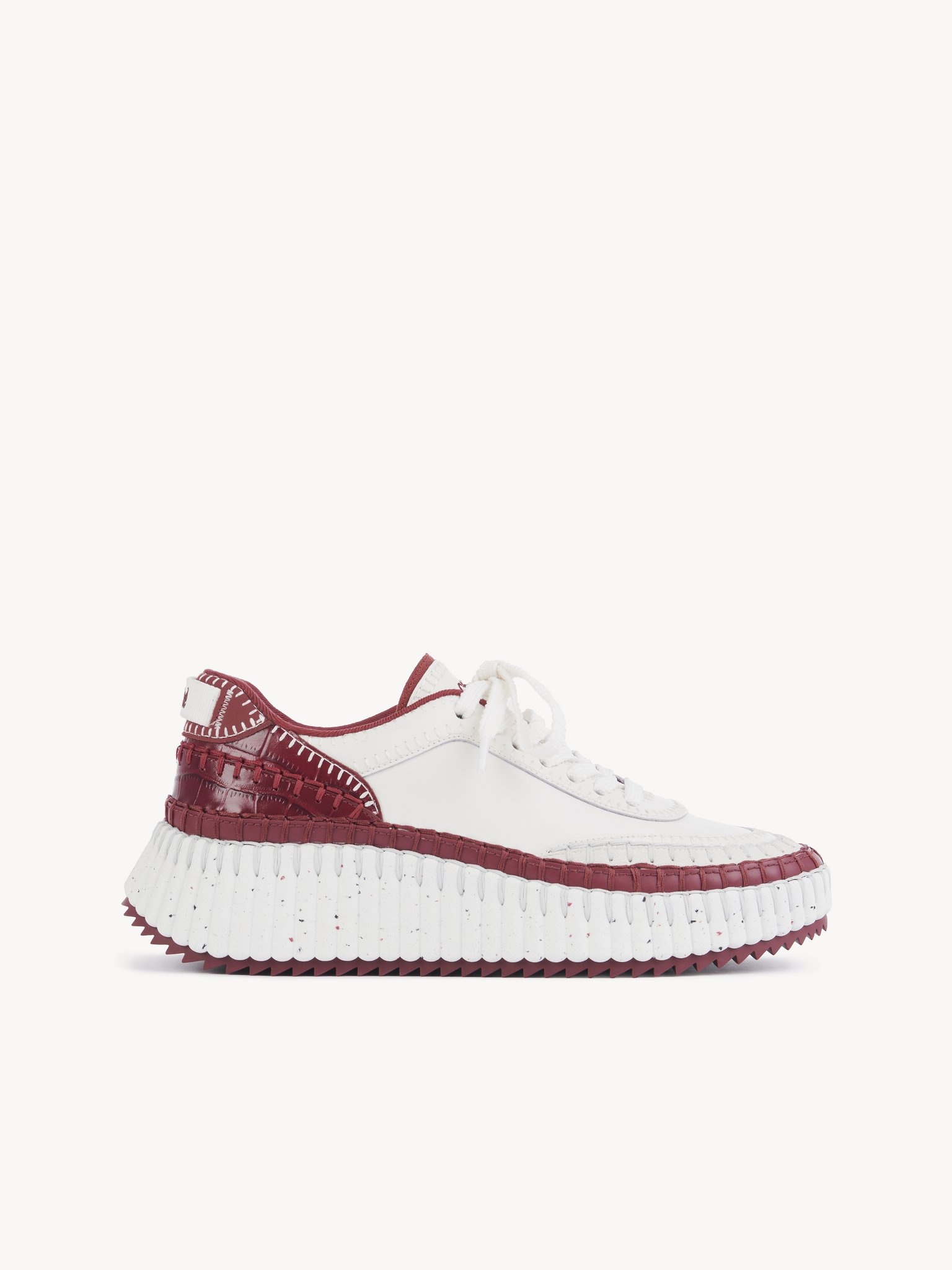 Crafted from a mix of smooth and croco-effect cowhide, these Nama sneakers are set on an iconic, lightweight and ultra-comfortable recycled sole with a speckled effect. They are finished with immaculate blanket stitching which takes 4.5 hours to complete by hand. Chloe logo embroidery signs the tongue. PRODUCT DETAILS Sneaker heel height: 2" (5 cm) Heel-to-toe drop: 0.8" (2 cm) Upper 1: cowhide Upper 2: croco-effect cowhide Upper 3: polyester Upper 4: polyester Inner sole: ethylene vinyl acetate Main lining: 95% polyester, 5% elastane Secondary lining: calfskin Sole: 50% ethylene vinyl acetate, 50% rubber Fit true to size, European sizing - Lace-up To make this product, Chloe worked with Leather Working Group (LWG) certified leather manufacturers. LWG certifies tanneries based on their water and energy usage, management of chemicals, solid waste, and wastewater. Color: Obscure Red Item code: CHC25U00RSA619
