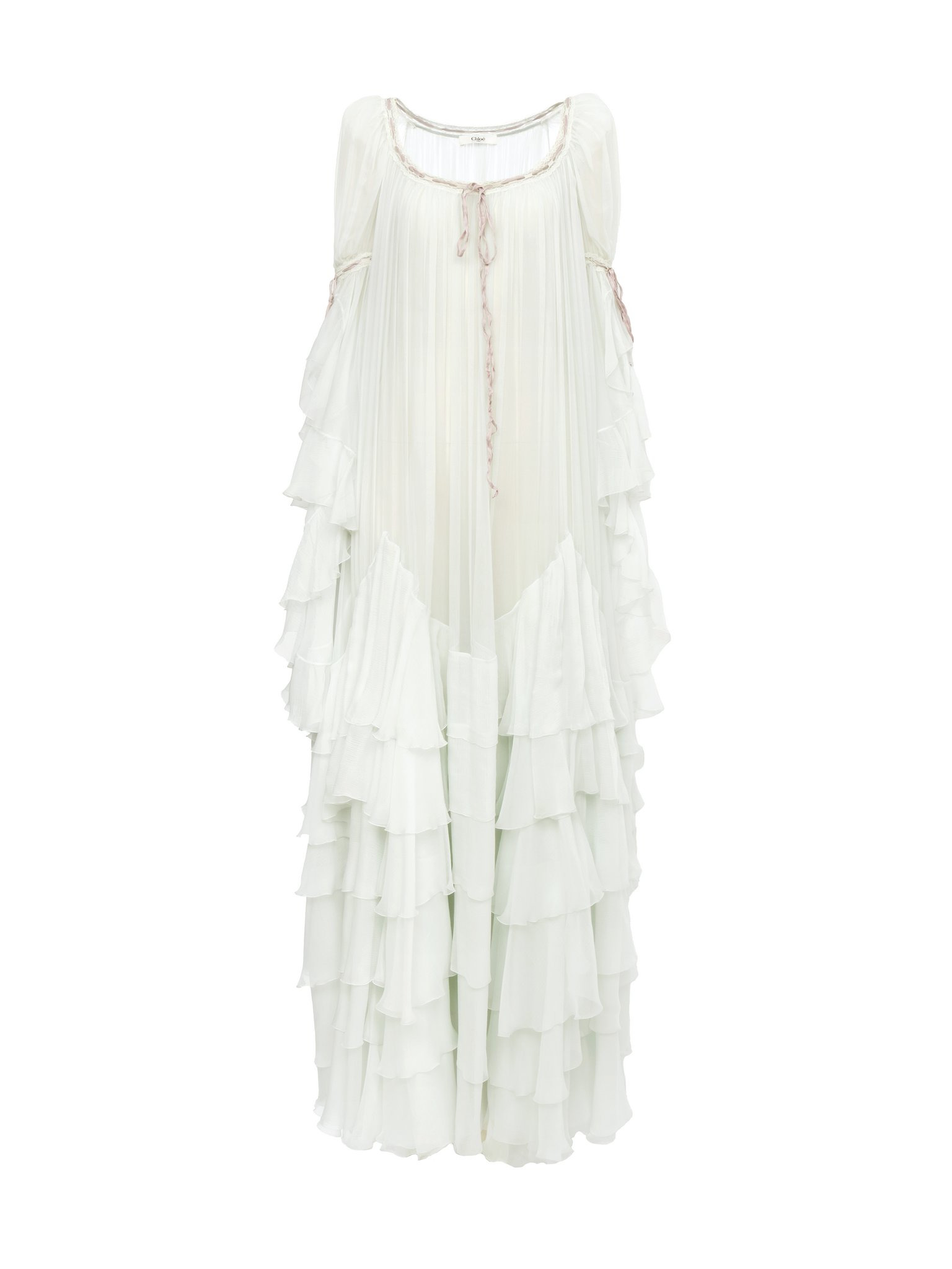 Scoop-neck oversized long ruffled dress in organic silk mousseline with a silk-mix lining, featuring tiered ruffles and drawstring ties. PRODUCT DETAILS Long ruffled dress outer shell: 100% Silk Lining: 68% Acetate fiber, 32% Silk Fit: oversized, long - The model is 5'10" (178 cm) and wears a prototype in size 36 - Oversized silk dress - Drawstring neck & sleeves Organic silk manufacturing restricts the use of pesticides, insecticides or harsh chemicals and incorporates methods that respect biodiversity, improve soil quality and reduce water consumption. This product was made in collaboration with Akanjo, a certified WFTO supplier. Akanjo is a social enterprise located in Madagascar that places equal pay and employees' health & wellbeing at the core of their priorities. A long-standing partner of Chloe for 15 years, Akanjo is also committed to training and promoting craftsmanship. Color: Slightly Grey Item code: CH25WRO6600101O