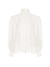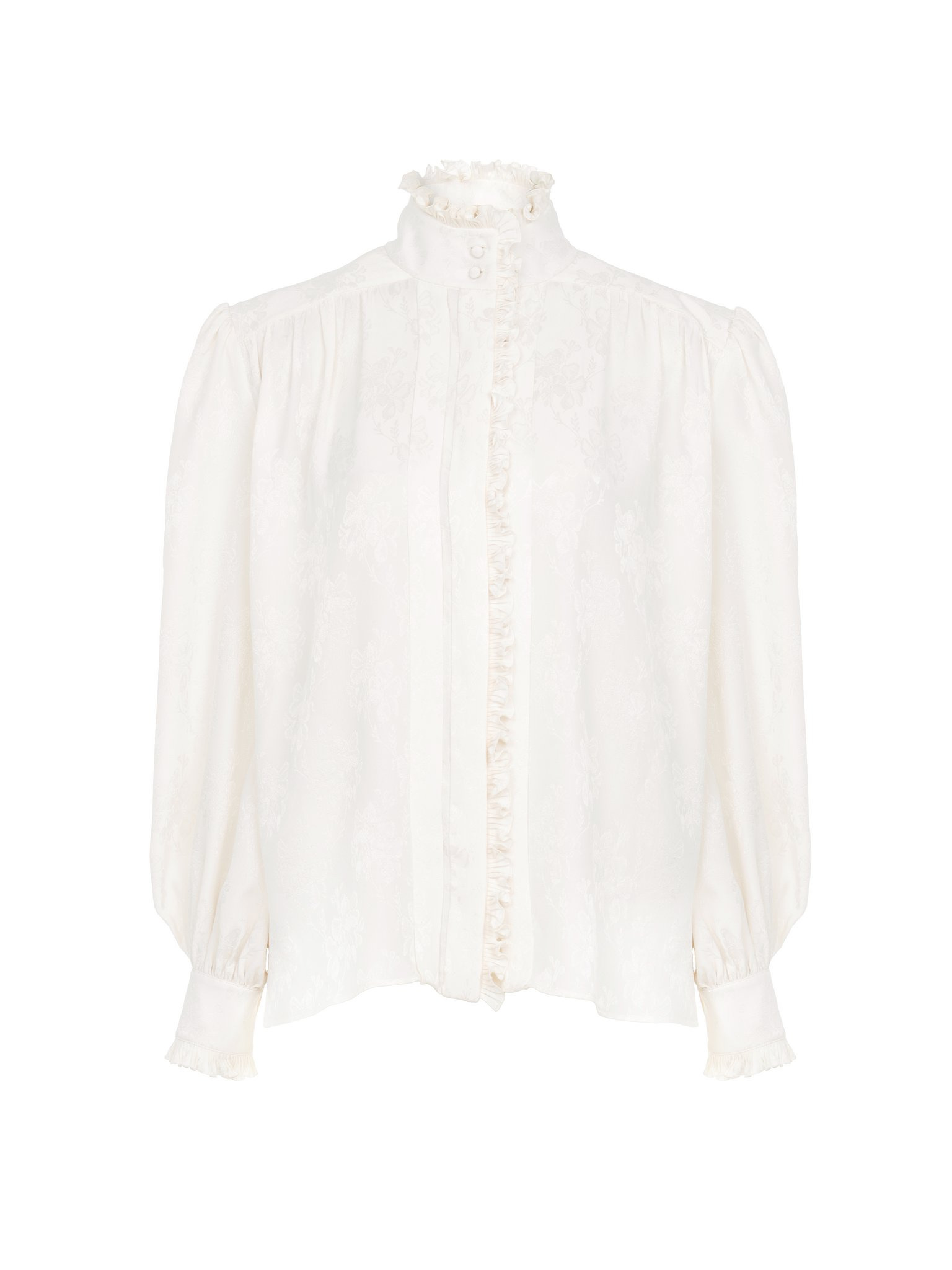 Oversized ruffled blouse in matte and shiny organic silk with a floral jacquard pattern, featuring gathered details and fabric-covered buttons. PRODUCT DETAILS Ruffled blouse outer shell: 100% Silk Buttons: 100% Mother-of-pearl Fit: oversized - The model is 5'10" (178 cm) and wears a prototype in size 36 - Silk blouse - Concealed mother-of-pearl buttons through front - Fabric-covered buttons at collar & cuffs Organic silk manufacturing restricts the use of pesticides, insecticides or harsh chemicals and incorporates methods that respect biodiversity, improve soil quality and reduce water consumption. This product was made in collaboration with Akanjo, a certified WFTO supplier. Akanjo is a social enterprise located in Madagascar that places equal pay and employees' health & wellbeing at the core of their priorities. A long-standing partner of Chloe for 15 years, Akanjo is also committed to training and promoting craftsmanship. Color: Iconic Milk Item code: CH25WHT40323107