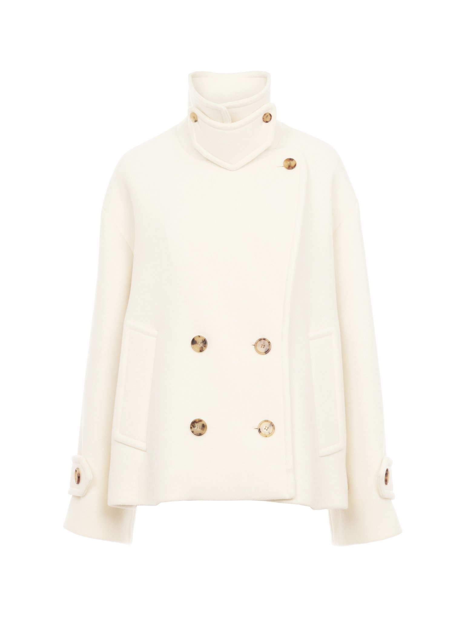 Double-breasted oversized short coat in iconic soft wool with a chin-strap collar and horn buttons. PRODUCT DETAILS Short coat outer shell: 80% Wool, 20% Polyamide Lining: 62% Viscose, 38% Cotton Buttons: 100% Water buffalo horn Fit: oversized - The model is 5’10” (178 cm) and wears a prototype in size 36 - Oversized wool coat - Horn buttons at front, chin strap & cuffs - Side pockets Care: dry cleaning only Color: Eden White Item code: CH24WMA96072112