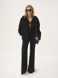 Double-breasted oversized short coat in iconic soft wool with a chin-strap collar and horn buttons. PRODUCT DETAILS Oversized short coat outer shell: 80% Wool, 20% Polyamide Lining: 62% Viscose, 38% Cotton Buttons: 100% Water buffalo horn Fit: oversized, short - The model is 5'10" (178 cm) and wears a prototype in size 36 - Oversized wool coat - Engraved horn buttons at front, chin strap & cuffs - Side pockets Color: Black Item code: CH25AMA96952001