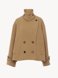 Double-breasted oversized short coat in iconic soft wool with a chin-strap collar and horn buttons. PRODUCT DETAILS Short coat outer shell: 80% Wool, 20% Polyamide Lining: 62% Viscose, 38% Cotton Buttons: 100% Water buffalo horn Fit: oversized - The model is 5’10” (178 cm) and wears a prototype in size 36 - Oversized wool coat - Horn buttons at front, chin strap & cuffs - Side pockets Care: dry cleaning only Color: Worn Brown Item code: CH24WMA9607226A