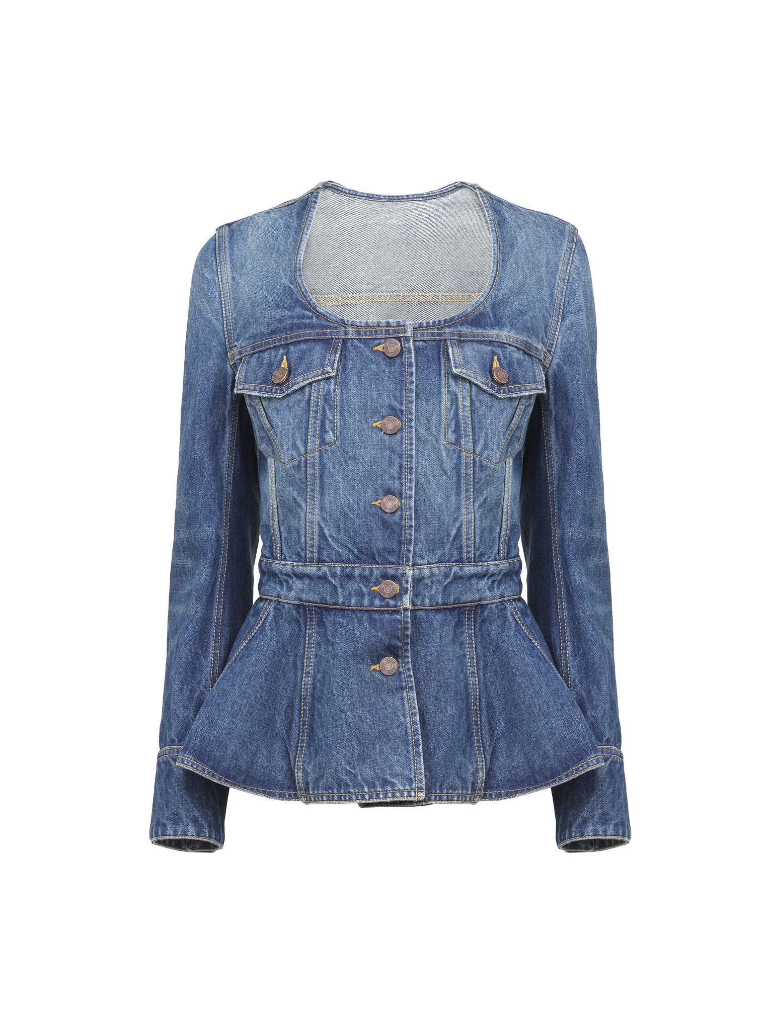 Scoop-neck peplum riding jacket in indigo wash organic cotton denim with Chloe-engraved buttons and flap chest pockets. PRODUCT DETAILS Riding jacket outer shell: 100% Cotton Fit: fit & flare - The model is 5'10" (178 cm) and wears a prototype in size 36 - Denim jacket - Chloe-engraved buttons at front, back, cuffs & pockets - Flap chest pockets An organic cotton farming system sustains the health of soils, ecosystems and people by eliminating the use of toxic and persistent organic pollutants and increasing water conservation. Color: Faded Indigo Item code: CH25WDV041534A1