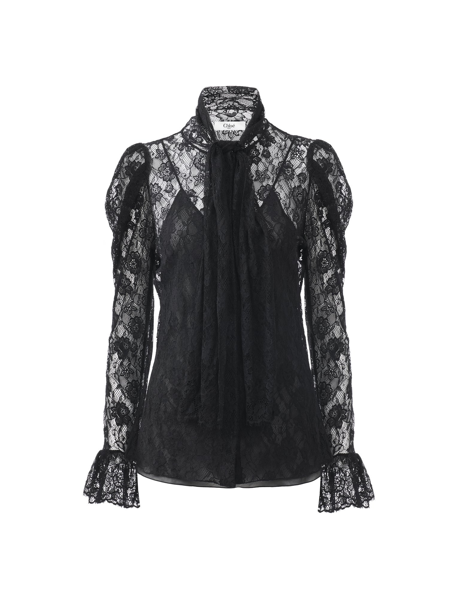Long-sleeve lavalliere top in floral lace jacquard with a separate silk-mix tank top lining. Puff shoulders, flared cuffs and mother-of-pearl buttons finish this piece. PRODUCT DETAILS Lavalliere top outer shell: 100% Polyamide Separate lining: 68% Acetate fiber, 32% Silk Buttons: 100% Mother-of-pearl Fit: fitted - The model is 5'10" (178 cm) and wears a prototype in size 36 - Long-sleeve top - Mother-of-pearl buttons through front & at cuffs - Separate tank top lining This product was made in collaboration with Akanjo, a certified WFTO supplier. Akanjo is a social enterprise located in Madagascar that places equal pay and employees' health & wellbeing at the core of their priorities. A long-standing partner of Chloe for 15 years, Akanjo is also committed to training and promoting craftsmanship. Color: Black Item code: CH25AHT57328001