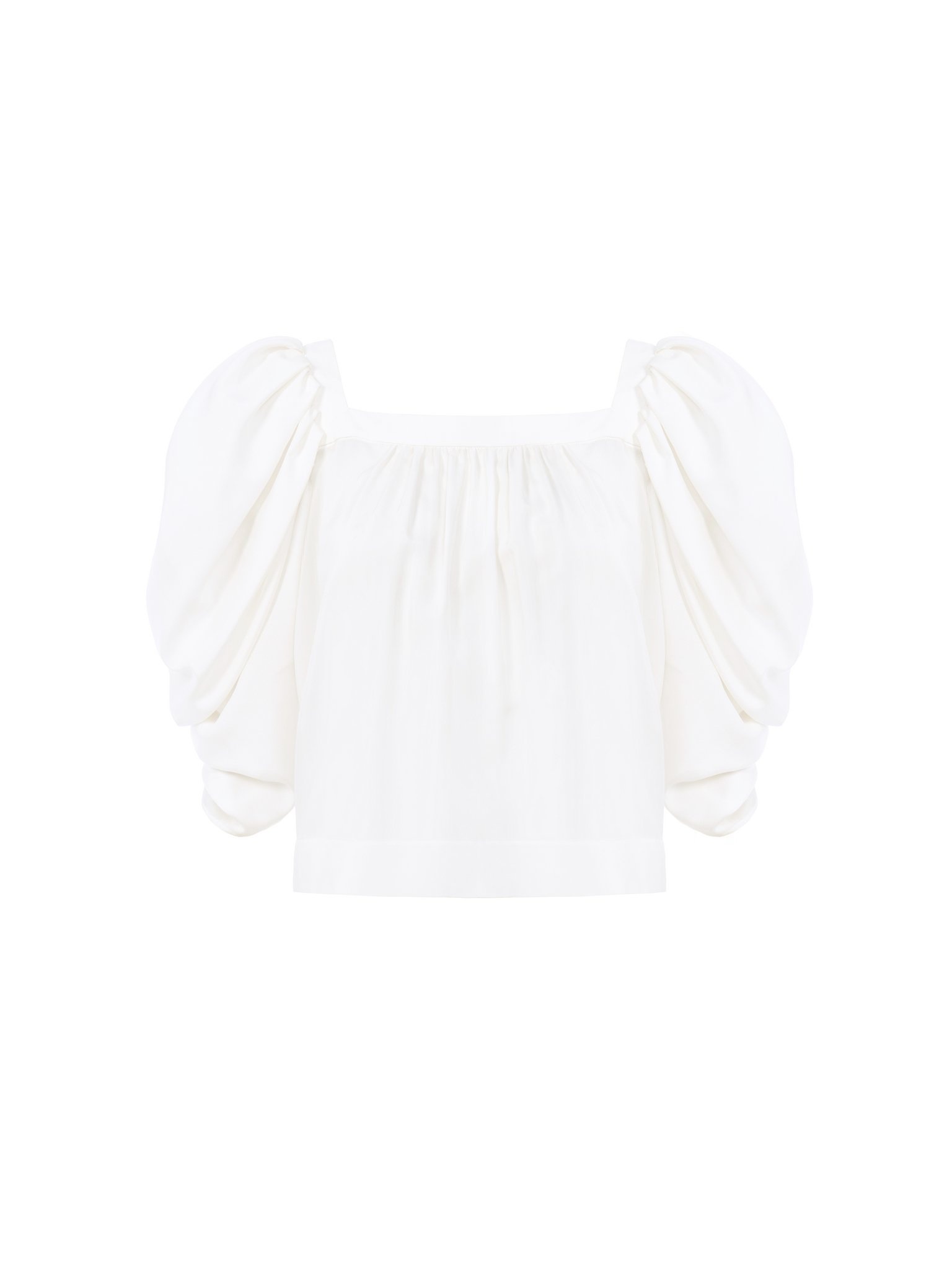 Puff-sleeve pleated top in silk poplin with a square neckline and a fluid silhouette. PRODUCT DETAILS Pleated top outer shell: 100% Silk Fit: fluid - The model is 5'10" (178 cm) and wears a prototype in size 36 - Puff-sleeve silk top - Slips on Care: dry cleaning only This product was made in collaboration with Akanjo, a certified WFTO supplier. Akanjo is a social enterprise located in Madagascar that places equal pay and employees' health & wellbeing at the core of their priorities. A long-standing partner of Chloe for 15 years, Akanjo is also committed to training and promoting craftsmanship. Color: Iconic Milk Item code: CH25UHT34452107