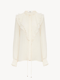 DESCRIPTION Fluid ruffled blouse in silk georgette, featuring a scalloped flower lace trim, pintucks down the front and dangling ties finished with gold-toned metal tips. PRODUCT DETAILS Ruffled blouse outer shell: 100% Silk Braid: 90% Cotton, 10% Polyamide Buttons: 100% Mother-of-pearl Fit: fluid - The model is 5'10"" (178 cm) and wears a prototype in size 36 - Ruffled silk blouse - Mother-of-pearl buttons through front & at cuffs - Ties with hammered metal tips This product was made in collaboration with Akanjo, a certified WFTO supplier. Akanjo is a social enterprise located in Madagascar that places equal pay and employees' health & wellbeing at the core of their priorities. A long-standing partner of Chloe for 15 years, Akanjo is also committed to training and promoting craftsmanship. Color: Dusty White Item code: CH26SHT64335115 CARE INSTRUCTIONS To preserve the integrity of your garment, please refrain from washing, entrusting its care to professional cleaning services for optimal maintenance. This garment cannot withstand any bleaching agent. To maintain its shape, gently iron this garment at a maximum sole plate temperature of 110°C, taking care to avoid any harsh pressure while ironing. Entrust this garment to a specialist for mild cleaning with tetrachloroethylene and solvent F, ensuring its delicate nature is maintained with the most care. To best preserve its form and texture, please do not tumble dry this garment. To maintain its delicate nature, do not wet clean this garment. TRACEABILITY Better traceability is central to improving our materials as well as social and environmental practices. Finishing: Italy Dyeing: Italy Weaving: China