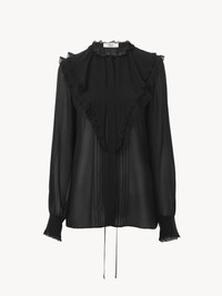 Fluid ruffled blouse in silk georgette, featuring a scalloped flower lace trim, pintucks down the front and dangling ties finished with gold-toned metal tips. PRODUCT DETAILS Ruffled blouse outer shell: 100% Silk Braid: 90% Cotton, 10% Polyamide Buttons: 100% Mother-of-pearl Fit: fluid - The model is 5'10" (178 cm) and wears a prototype in size 36 - Ruffled silk blouse - Mother-of-pearl buttons through front & at cuffs - Ties with hammered metal tips Care: dry cleaning only This product was made in collaboration with Akanjo, a certified WFTO supplier. Akanjo is a social enterprise located in Madagascar that places equal pay and employees' health & wellbeing at the core of their priorities. A long-standing partner of Chloe for 15 years, Akanjo is also committed to training and promoting craftsmanship. Color: Black Item code: CH25SHT24335001