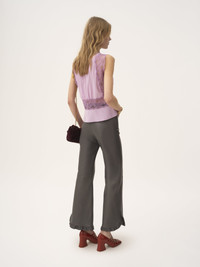 Flared pants in soft lambskin with a ruffled hem. PRODUCT DETAILS Flared pants outer shell: 100% Sheepskin Main lining: 62% Viscose, 38% Cotton Pocket lining: 100% Cotton Fit: flared - The model is 5'10" (178 cm) and wears a prototype in size 36 - Leather pants - Front zipper & Chloe-engraved button fastening - Side pockets & mini front patch pocket - Belt loops To make this product, Chloe worked with Leather Working Group (LWG) certified leather manufacturers. LWG certifies tanneries based on their water and energy usage, management of chemicals, solid waste, and wastewater. Color: Sandy Black Item code: CH25ACP30204011