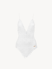 DESCRIPTION One-piece swimsuit in stretch broderie anglaise, featuring a V-neck, thin straps and ruffle trims. A gold-tone Chloe logo plate signs the left hip. PRODUCT DETAILS One-piece swimsuit outer shell: 80% Polyamide, 20% Elastane Inner lining: 83% Polyamide, 17% Elastane Fit: fitted - The model is 5'10" (178 cm) and wears a prototype in size 36 - Ruffled swimsuit - No fastenings Color: White Item code: CH25AMB12471101 CARE INSTRUCTIONS To preserve the integrity of your garment wash it by hand at a maximum of 40°C, ensuring its delicate fibers are treated with care. This garment cannot withstand any bleaching agent. To maintain its shape, refrain from ironing this garment. To best preserve its texture and form, do not dry clean this garment. To maintain its delicate nature, do not wet clean this garment. To best preserve its form and texture, please do not tumble dry this garment. TRACEABILITY Better traceability is central to improving our materials as well as social and environmental practices. Dyeing: Italy Weaving: Italy