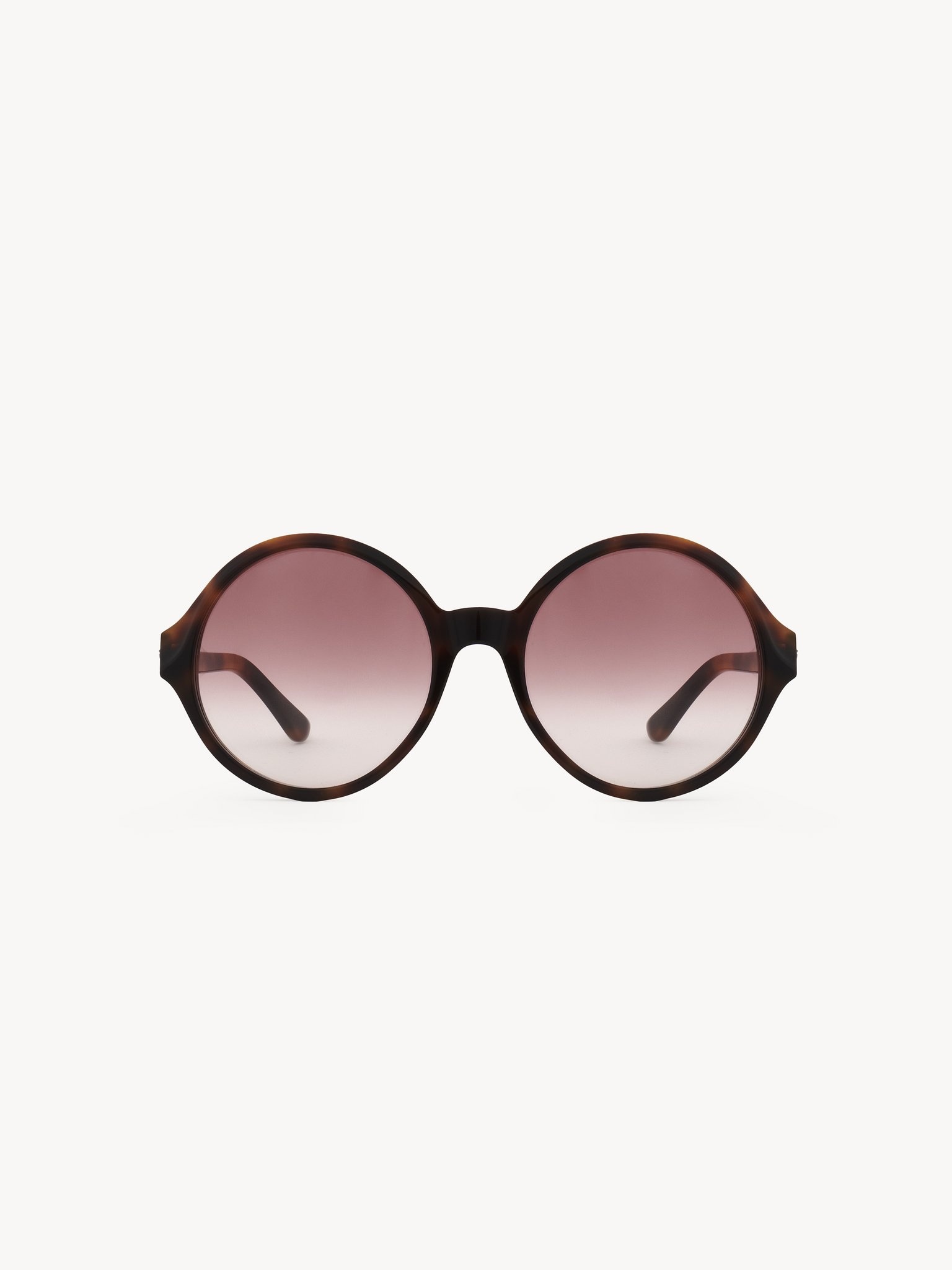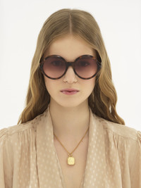 The Salome round sunglasses feature a shiny Havana frame in lower-impact acetate with scalloped detailing and low temples signed with the Chloe logo. Gradient burgundy and crystal lenses finish these 70s-style sunglasses. PRODUCT DETAILS Round sunglasses in lower-impact acetate & bio-based nylon - 100% UVA and UVB protection - Not prescription friendly - Chloe logo plate on the temples - Filter category: 2 These sunglasses come with a case and lens cloth - Lens: 2.2" (57 mm) - Bridge: 0.8" (20 mm) - Temple: 5.5" (140 mm) - Havana lower-impact acetate frame - Gradient burgundy & crystal lenses Item code: CHC25SEK0290230