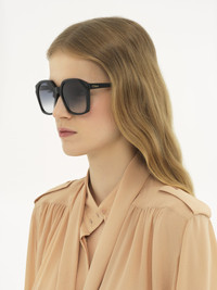 Square Salome sunglasses with a sharp design and scallop details for a '70s-inspired aesthetic. Made from lower-impact acetate, the shiny transparent dark gray frame is paired with gradient blue/crystal lenses in bio-based nylon. A gold-toned Chloe logo plate signs both temples. PRODUCT DETAILS Square sunglasses in lower impact acetate & bio-based nylon - 100% UVA and UVB protection - Not prescription friendly - Filter category: 2 - Chloe logo engraved on both temples These sunglasses come with a case and lens cloth - Lens: 2.2" (57 mm) - Bridge: 0.7" (17 mm) - Temple: 5.5" (140 mm) - Dark Havana frame - Gradient blue/crystal lenses Item code: CHC24WEK0280001