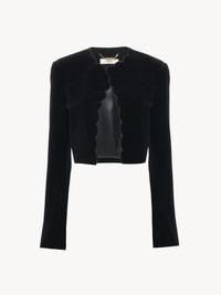 Scalloped Spencer jacket in a soft, matte cotton velvet, featuring scallop embroidery along the neck and front for signature detail. PRODUCT DETAILS Scalloped Spencer jacket outer shell: 100% Cotton Lining: 100% Silk Embroidery thread: 100% Viscose Fit: fitted - The model is 5'10" (178 cm) and wears a prototype in size 36 - Cropped velvet jacket - No fastenings Care: dry cleaning only Color: Black Item code: CH25SVE01017001