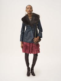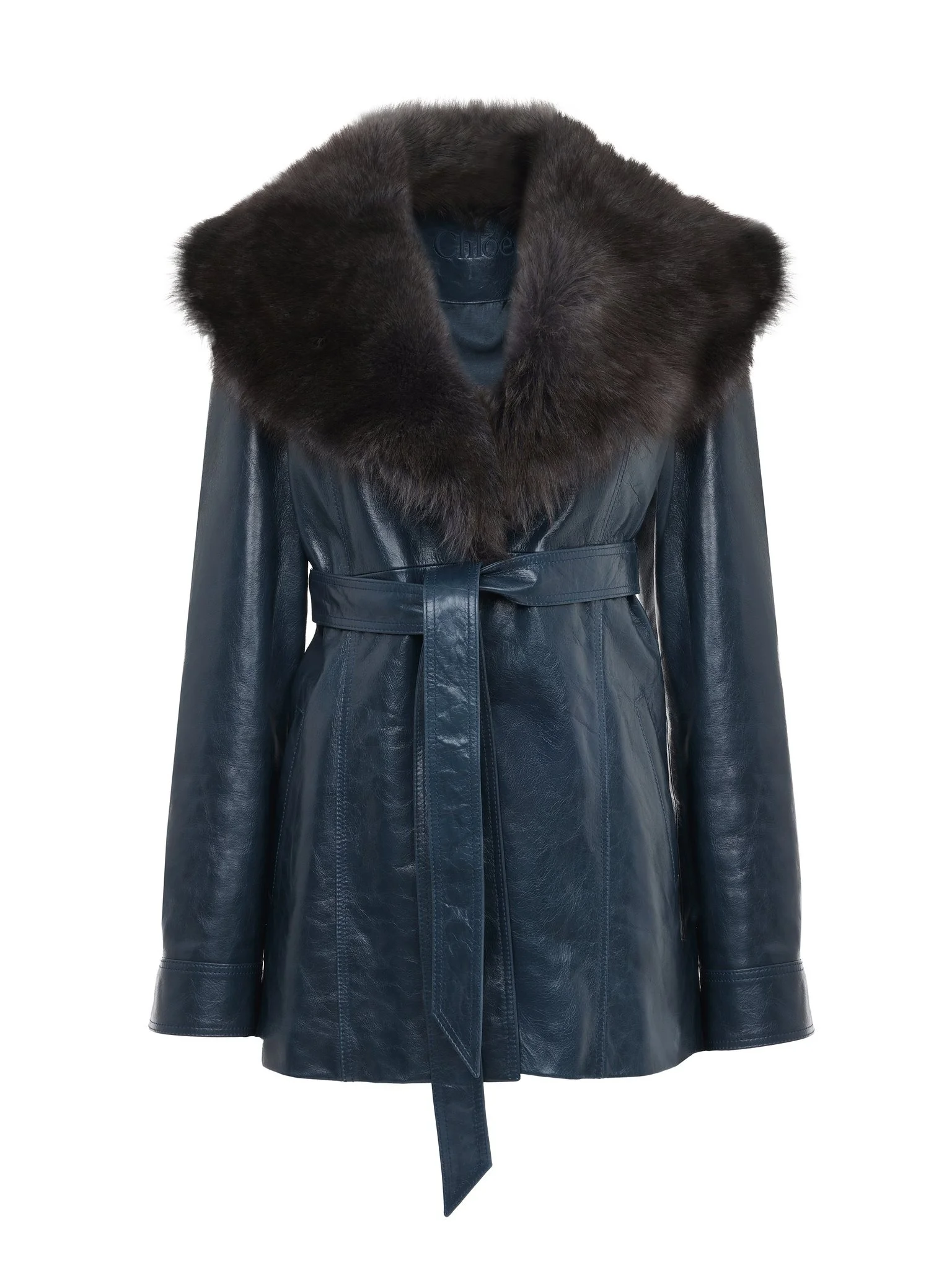 Short coat in shiny cowhide with a contrast shearling maxi collar, finished with a tonal leather belt knotted at the waist. PRODUCT DETAILS Short coat outer shell: 100% Cowhide Collar application: 100% Lambskin Main lining: 62% Viscose, 38% Cotton Pocket lining: 100% Cotton Fit: straight - The model is 5'10" (178 cm) and wears a prototype in size 36 - Chloe leather coat - Engraved horn buttons at front, collar & cuffs - Side pockets - Tonal leather belt To make this product, Chloe worked with Leather Working Group (LWG) certified leather manufacturers. LWG certifies tanneries based on their water and energy usage, management of chemicals, solid waste, and wastewater. Color: Military Blue Item code: CH25ACM3420943D