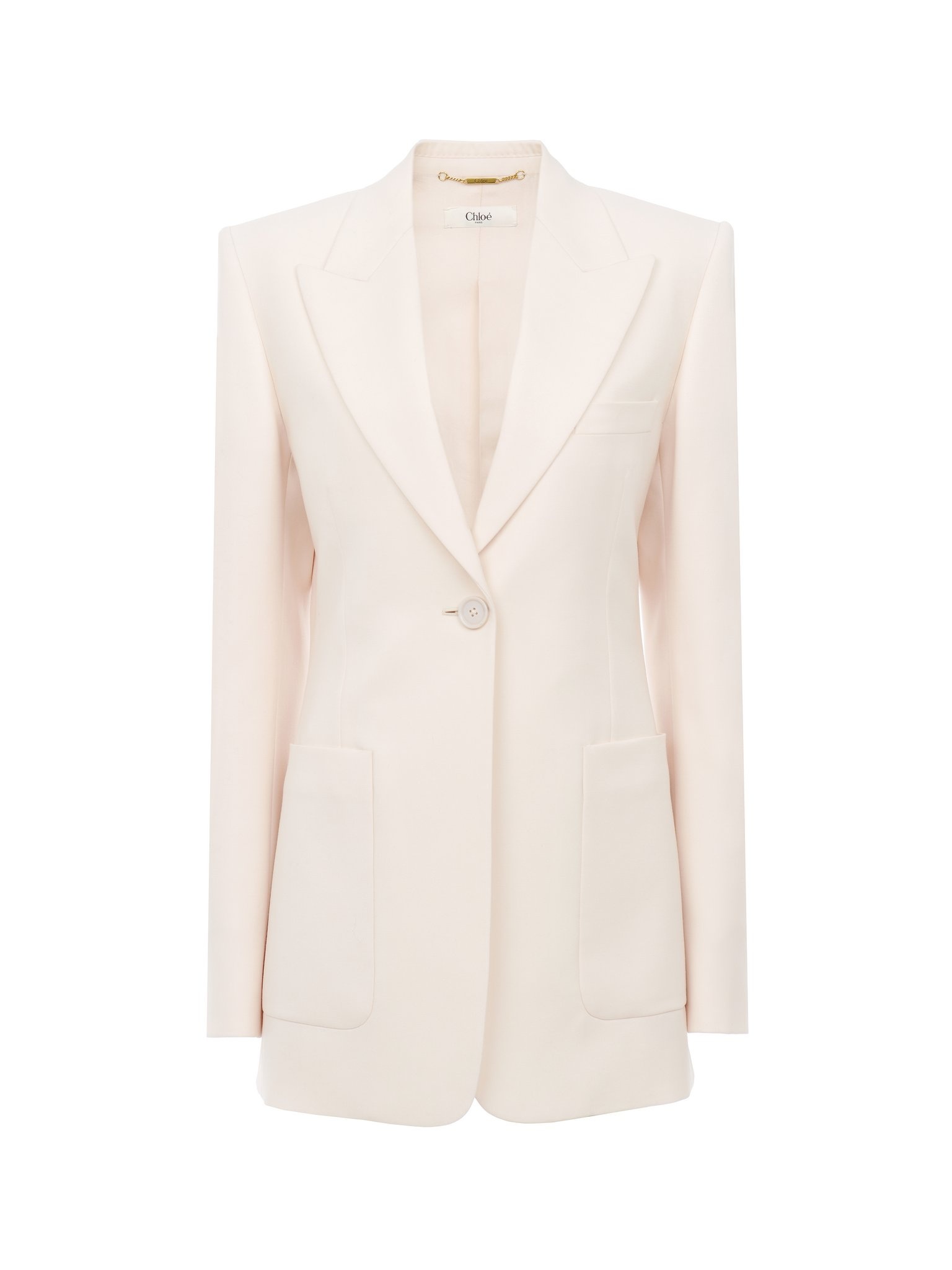 Single-breasted tailored jacket in lower-impact light wool gabardine, featuring oversized front patch pockets and engraved tonal horn buttons. PRODUCT DETAILS Single-breasted tailored jacket outer shell: 100% Wool Lining: 100% Silk Buttons: 100% Water buffalo horn Fit: tailored - The model is 5'10" (178 cm) and wears a prototype in size 36 - Single-breasted Chloe wool jacket - Engraved horn buttons at front & cuffs - Oversized front patch pockets The wool used in this product comes from a farm that respects animal welfare, maintains soil health, protects biodiversity and promotes native species. Color: Biscuit Pink Item code: CH25AVE520666H7