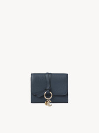 The Maison's iconic Alphabet line includes this tri-fold wallet in grained and shiny calfskin. Designed to hold the essentials, it features multiple card slots and one flat pocket. The front is finished with a knotted link and Chloe-designed golden initial charms. This small wallet will slip easily into your clutch or a small bag. PRODUCT DETAILS Small tri-fold wallet with leather link in grained & shiny calfskin Main lining: Lambskin Flap lining: Calfskin Inside trim: 65% Polyester, 35% Cotton - 1 flat pocket - 6 card slots - 1 bill compartment - Snap fastening Comes with a dust bag - Width: 4.3" (11 cm) - Height: 3.5" (9 cm) - Depth: 1.6" (4 cm) To make this product, Chloe worked with Leather Working Group (LWG) certified leather manufacturers. LWG certifies tanneries based on their water and energy usage, management of chemicals, solid waste, and wastewater. Color: Tapestry Blue Item code: CHC21WP718F5744Q
