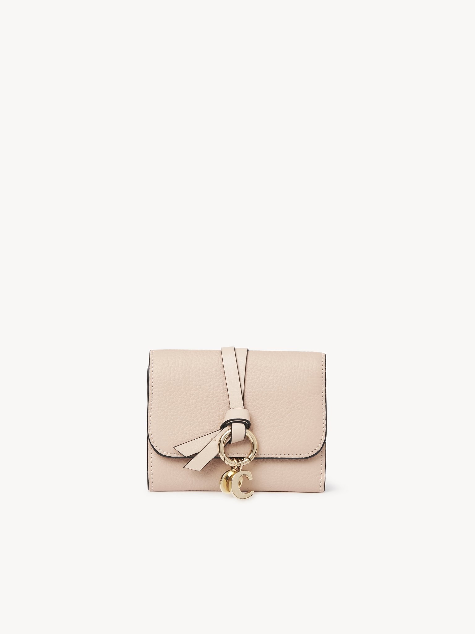 The Alphabet small tri-fold wallet with leather link is an elegant accessory designed to hold the essentials. Crafted from grained and shiny calfskin, the wallet's small proportions make the Chloe-designed golden initial charms more striking. The delicate leather link and gold metal loop add a feminine and decorative touch. Compact by design, this small wallet will slip easily into your clutch or a small bag. All about Alphabet... The Alphabet line combines timeless elegance with a playful touch: personalize your accessory by attaching your initial charm or a secret message to the refined hardware. PRODUCT DETAILS Tri-fold wallet with leather link in grained & shiny calfskin - 1 bill compartment - 1 front external pocket Comes with a dust bag - Width: 4.3" (11 cm) - Height: 3.5" (9 cm) This small wallet is made from semi-aniline leather. The half-transparent finish imparts a robust nature to the product while preserving its natural character. Follow care instructions on the leaflet. Color: cement pink Item code: CHC21WP718F576J5