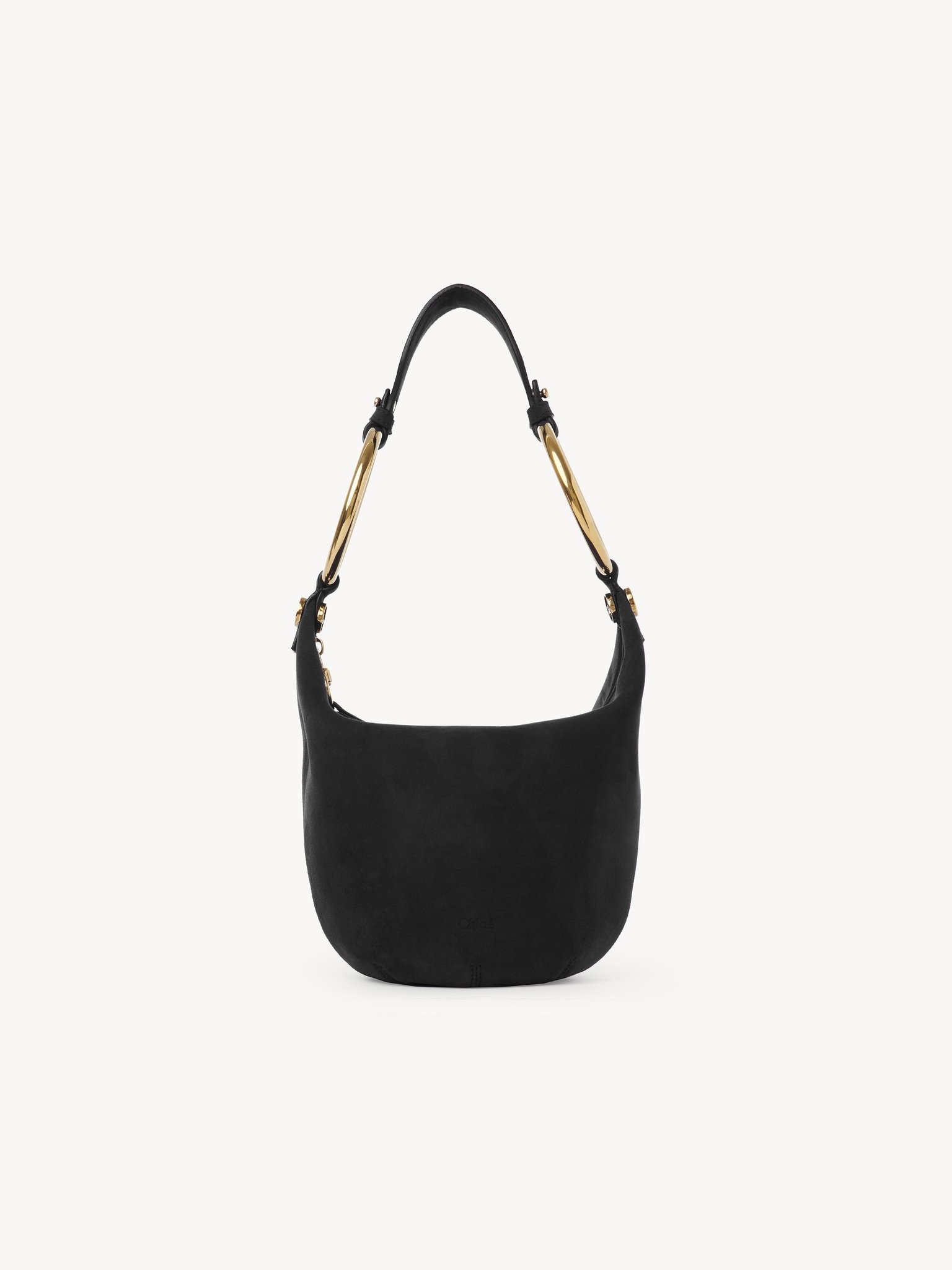 This small Bracelet shoulder bag is crafted from suede goatskin. The supple, rounded shape is elevated by oversized bracelet handles secured by the Maison's signature Horse Medal hardware. This Bracelet bag comes with a removable strap for hand, shoulder and wrist carry. PRODUCT DETAILS Small Bracelet handbag in suede goatskin Main material: Goatskin Secondary material: Buffalo leather Main lining: Lambskin Carry: Hand, shoulder & wrist - 1 main compartment - 1 small inside pocket - 1 removable leather handle - Zip closure Comes with a dust bag - Width: 6.7" (17 cm) - Height: 6.3" (16 cm) - Depth: 5.5" (14 cm) - Handle drop: 10.6" (27 cm) - Ring drop: 7.1" (18 cm) This handbag is made of top-grain leather. Avoid contact with fatty products, creams, perfumes, hydroalcoholic gels, makeup and ink To make this product, Chloe worked with Leather Working Group (LWG) certified leather manufacturers. LWG certifies tanneries based on their water and energy usage, management of chemicals, solid waste, and wastewater. Color: Black Item code: CHC25SS618O84001