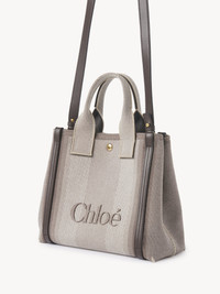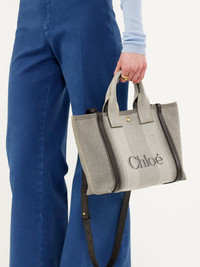 The small Chloe Carry tote bag is crafted from striped cotton canvas jacquard, complemented by contrasting vertical leather bands and an oversized Chloe logo. This day bag has magnets at the sides, allowing the structured silhouette to be adjusted to a rounded, more compact shape. Carry with the double handles or the adjustable, removable strap. PRODUCT DETAILS Small Chloe Carry tote bag in cotton canvas Main material: 91% Cotton, 6% Polyester, 3% Other fibers <5% Secondary material: Calfskin Main lining: 91% Cotton, 6% Polyester, 3% Other fibers <5% Carry: Hand, shoulder & crossbody - 1 main compartment - 1 inside flat pocket - Adjustable & removable strap - Snap closure Comes with a dust bag - Width: 10.6" (27 cm) - Height: 9.3" (23.5 cm) - Depth: 4.7" (12 cm) - Handle drop: 4.3" (11 cm) - Min. strap drop: 19.7" (50 cm) - Max. strap drop: 22.8" (58 cm) This tote bag is made from a very natural cotton-based fabric. Keep away from water (rain). This product is made from recycled cotton. Recycled cotton keeps its natural softness and inherent quality with a reduced environmental impact. Using recycled cotton enables us to extend the lifespan of a fiber that has already been produced. Color: Kohl Brown Item code: CHC25SS911O6524X