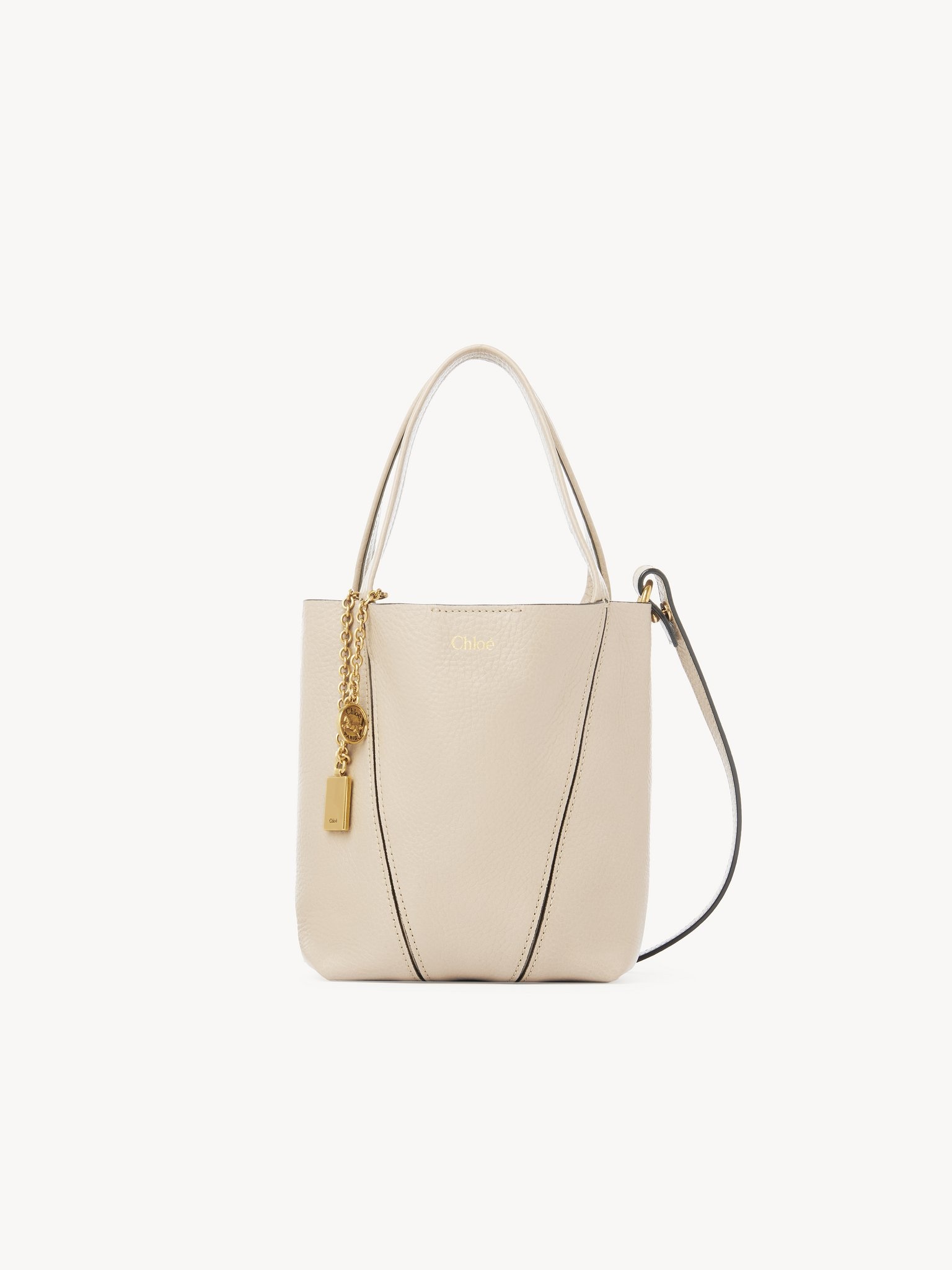 Crafted from shiny grained cowhide, the small Chloe Spin tote bag has a minimalist silhouette elevated with graphic lines. A dangling chain features the Maison's signature Chloe and Horse Medals. The compact interior combines with double handles and a removable strap. Wear on the shoulder, cross-body, or slide the handles through the ring for relaxed hand or wrist carry. PRODUCT DETAILS Small Chloe Spin tote bag in shiny grained cowhide Main material: Cowhide Main lining: Cowhide Carry: Shoulder, cross-body, hand & wrist - 1 main compartment - Removable and adjustable strap - Magnetic closure Comes with a dust bag - Width: 18 cm (7.1") - Height: 19 cm (7.5") - Depth: 8 cm (3.1") - Handle drop: 13 cm (5.1") - Min. strap drop: 60 cm (23.6") - Max. strap drop: 65 cm (25.6") This Chloe Spin bag is made with unlined leather, so there may be slight marks inside the bag, such as veins or scratches. Colour: Sweet Beige Item code: CH25SS812N8424Q