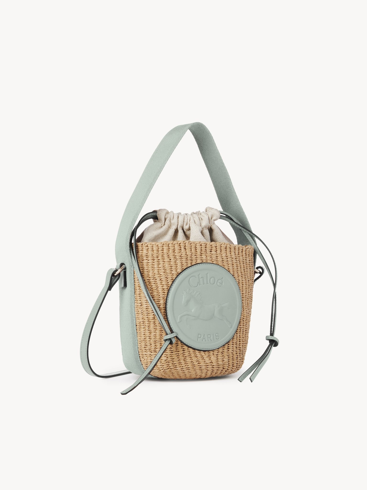 This small Horse Medal basket bag is handwoven from fair-trade paper by independent craftswomen in Kenya. The spacious, rounded compartment is finished with a signature calfskin medal, featuring the Chloe logo and an embossed image of a galloping horse. A cotton pouch with a leather drawstring keeps items secure. Carry your basket by the handle or on the shoulder with the leather strap. Each basket comes with a leather label signed by the craftsman who made it. PRODUCT DETAILS Small Horse Medal basket bag in fair-trade paper & calfskin Main material: Paper Secondary material: Calfskin Main lining: 55% Cotton, 45% Linen Trimming: Polyester Carry: Hand & crossbody - 1 main compartment - 1 inside pouch Comes with a dust bag - Width: 6.7" (17 cm) - Height: 6.3" (16 cm) - Depth: 6.3" (16 cm) This model has been handwoven with natural fibers, so the dimensions may slightly vary from one basket to another. - Handle drop: 6.3" (16 cm) - Strap drop: 17.9" (45.5 cm) Color: Bluish Green Item code: CHC25SS592O8238T