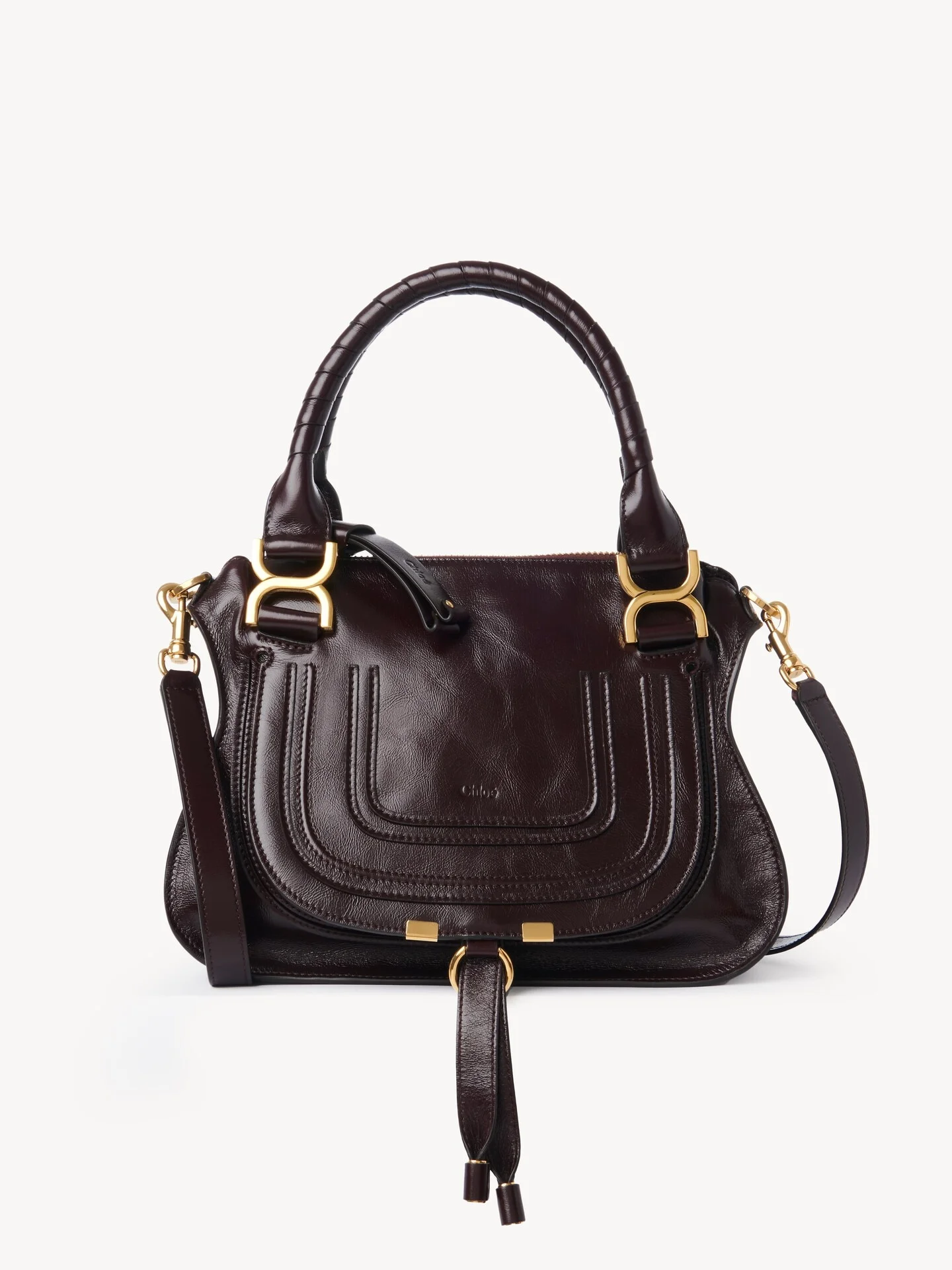 Crafted from shiny calfskin, this small Marcie handbag has a slouchy silhouette with feminine lines. It is finished with saddle stitching, iconic gold-tone buckles and hand-wrapped double handles. The line's dangling leather tassels secure the flap. Carry this leather bag in the hand, on the shoulder or cross-body with the handles or strap. PRODUCT DETAILS Small shoulder bag in shiny calfskin Main material: Calfskin Main lining: Calfskin Flap lining: Calfskin Carry: Hand, shoulder & cross-body - Roomy compartment - Zipped closure - Front slip pocket hidden by the flap - 1 internal zipped pocket - Removable leather strap attached with hooks Comes with a dust bag - Width: 11.8" (30 cm - Height: 9.1" (23 cm) - Depth: 3.5" (9 cm) - Strap drop: 20.1" (51 cm) This handbag is made from semi-aniline leather. The half-transparent finish imparts a robust nature to the product while preserving its natural character. Follow all care instructions on the insert. To make this product, Chloe worked with Leather Working Group (LWG) certified leather manufacturers. LWG certifies tanneries based on their water and energy usage, management of chemicals, solid waste, and wastewater. Color: Auburn Red Item code: CHC24AS628N57607