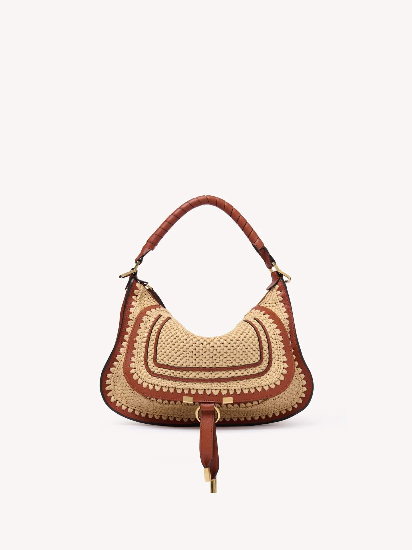 DESCRIPTION Crafted from raffia-effect and calfskin, this small Marcie shoulder bag reinterprets the line's iconic day bag with a slouchier silhouette. Saddle stitching, a single hand-wrapped handle and gold-tone hardware finish the updated design. The line's dangling leather tassels secure the flap. Carry this leather bag in the hand or on the shoulder, or crossbody with the adjustable leather strap. PRODUCT DETAILS Small Marcie shoulder bag in raffia-effect & calfskin Main material: Viscose Secondary material: Calfskin Main lining: Viscose Carry: Hand, shoulder & crossbody - 1 main compartment - 1 front slip pocket hidden by the flap - 1 internal flat pocket - 1 adjustable & removable leather strap - Zip closure Comes with a dust bag - Width: 13.4" (34 cm) - Height: 7.9" (20 cm) - Depth: 3.3" (8.5 cm) - Handle drop: 7.9" (20 cm) - Min. strap drop: 17.7" (45 cm) - Max. strap drop: 23.2" (59 cm) To make this product, Chloe worked with Leather Working Group (LWG) certified leather manufacturers. LWG certifies tanneries based on their water and energy usage, management of chemicals, solid waste, and wastewater. Color: Clay Brown Item code: CH26US882R6026M CARE INSTRUCTIONS In order to protect this article, we recommend that you: avoid overloading your bag avoid rubbing against abrasive materials shield it from humidity, light and heat avoid contact with liquids and greasy substances (makeup, cream) store your bag carefully in its dustcover when not in use avoid rubbing against color-contrasting clothes or materials to remove a water stain, gently soak up liquid by dabbing it with a white cloth should a scratch occur on the leather, you can gently massage it with the same type of cloth for all other issues, please contact the Chloe after-sales service or a specialist.