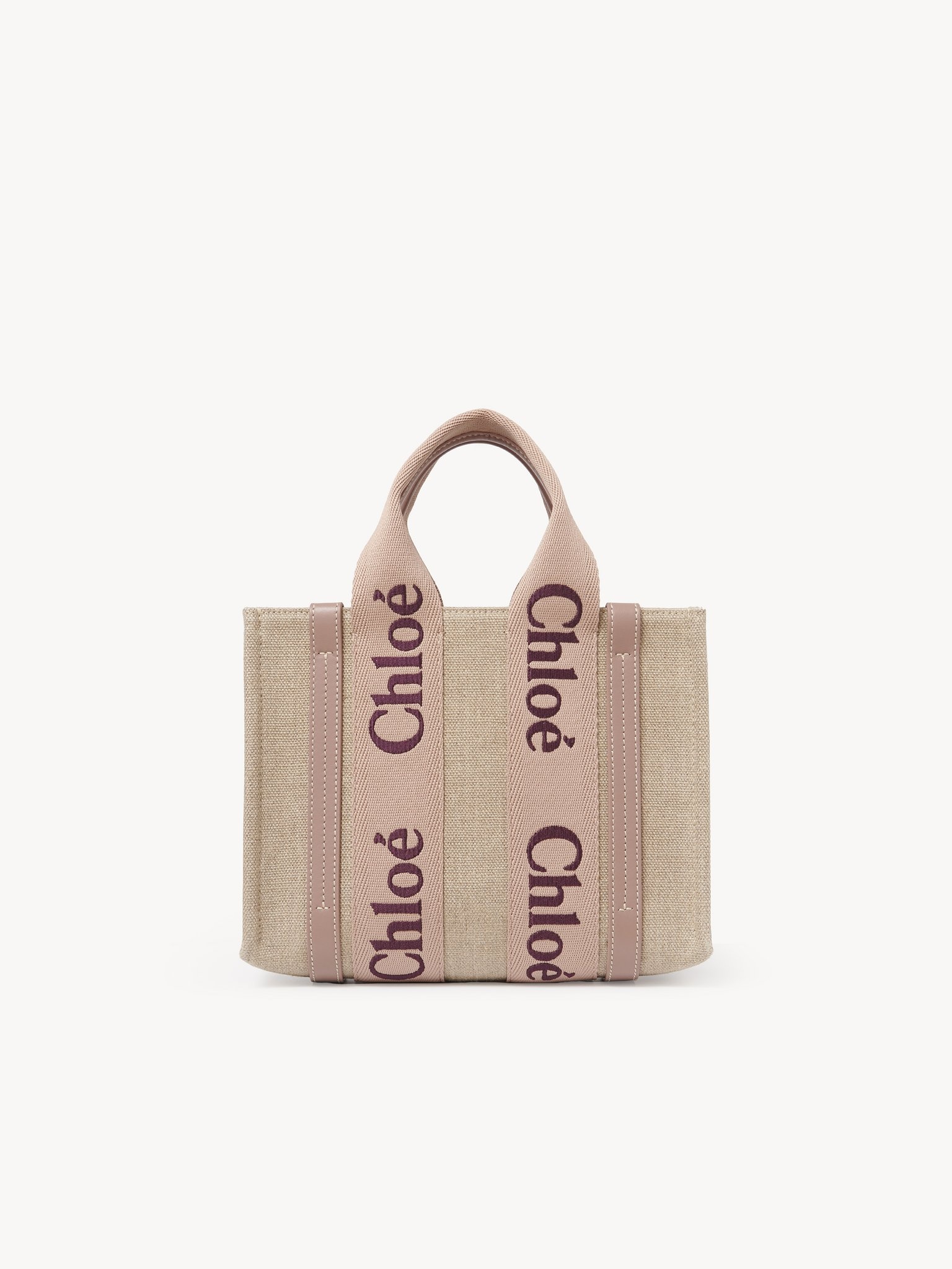 This small Woody tote bag is crafted from linen canvas, elevated by contrasting vertical strips in shiny calfskin and signature canvas ribbons embroidered with the Chloe logo. Carry in the hand with the double handles, or on the shoulder or crossbody with the removable strap. PRODUCT DETAILS Small Woody tote bag in linen canvas, calfskin and webbing with Chloe logo embroidery Main material: Linen Secondary material: Calfskin Main lining: 68% Linen, 32% Cotton Trimming: Polyester Carry: Hand, shoulder & crossbody - 2 short handles - Removable & adjustable long strap - 1 spacious main compartment - 1 internal flat pocket Comes with a dust bag - Width: 10.4" (26.5 cm) - Height: 7.9" (20 cm) - Depth: 3.1" (8 cm) - Handle drop: 4.3" (11 cm) - Min. strap drop: 20.5" (52 cm) - Max. strap drop: 22" (56 cm) This small bag is made from a woven fabrication adapted to leather goods requirements. A water-repellent treatment was applied to the fabric, but rain exposure should be avoided. Avoid rubbing this material against color-contrasting materials and shield it from humidity, light, heat, liquids and greasy substances. Follow all care instructions on the insert. Linen, hemp and ramie cultivations emit fewer greenhouse gases and require less water compared to other conventional natural fibers, which is why they are considered lower-impact materials by nature. To make this product, Chloe worked with Leather Working Group (LWG) certified leather manufacturers. LWG certifies tanneries based on their water and energy usage, management of chemicals, solid waste, and wastewater. Color: Tan Rose Item code: CHC23AS397L176L6