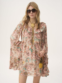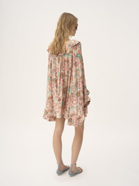 Square-neck ruffled mini dress in organic silk crepe de chine with a floral print inspired by the Maison's heritage. The fluid silhouette features flouncy trims at the neck and maxi sleeves. PRODUCT DETAILS Ruffled mini dress outer shell: 100% Silk Fit: fluid, midi length - The model is 5'10" (178 cm) and wears a prototype in size 36 - Long-sleeve mini dress - Slips on Organic silk manufacturing restricts the use of pesticides, insecticides or harsh chemicals and incorporates methods that respect biodiversity, improve soil quality and reduce water consumption. This product was made in collaboration with Akanjo, a certified WFTO supplier. Akanjo is a social enterprise located in Madagascar that places equal pay and employees' health & wellbeing at the core of their priorities. A long-standing partner of Chloe for 15 years, Akanjo is also committed to training and promoting craftsmanship. Color: Muddy Grey Item code: CH25ARO1206000B