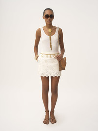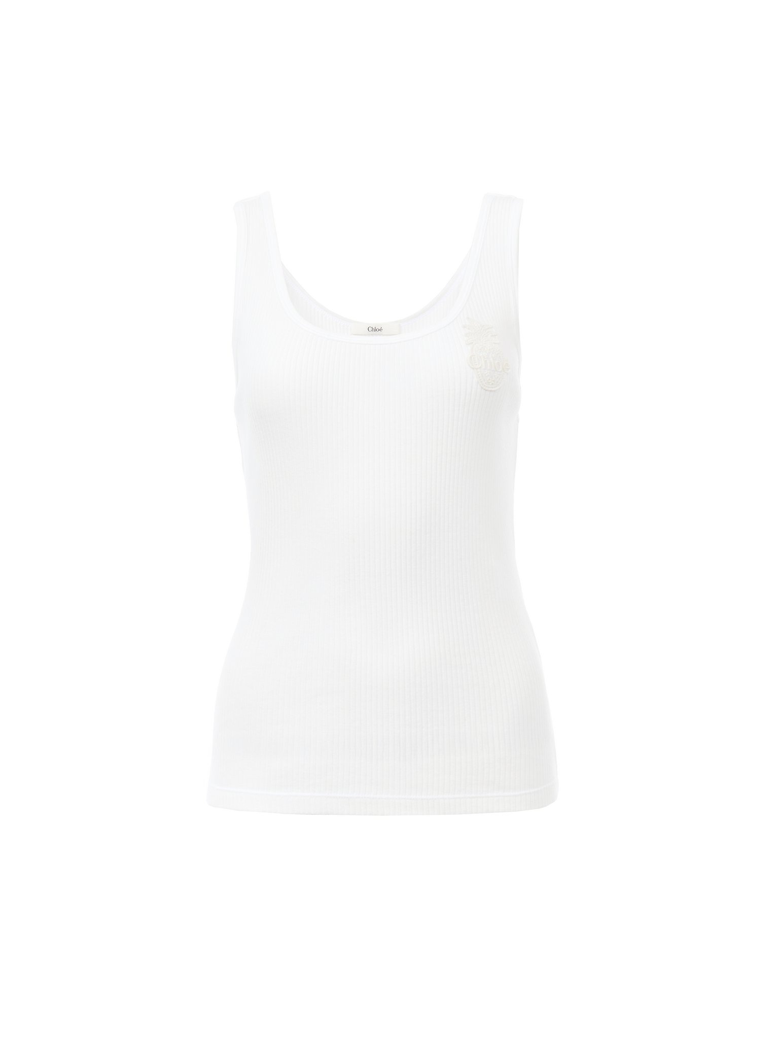 Fitted tank top in cotton jersey, featuring a Chloe logo pineapple patch at the chest. PRODUCT DETAILS Tank top outer shell: 100% Cotton Fit: fitted - The model is 5'10" (178 cm) and wears a prototype in size S - Chloe top - Slips on Color: White Item code: CH25AJH12176101