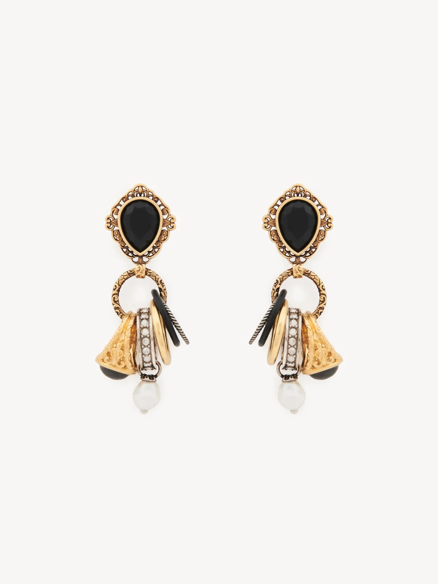 DESCRIPTION Chloe Antique Pearls dangling earrings in meticulously cut vintage gold brass, resin, Portoro marble and crystal glass. The ornamental design showcases a black faceted teardrop and a cluster of five rings with different textures and embellishments. The combination of gold and palladium tones nods to the Chloe DNA. PRODUCT DETAILS Dangling earrings in brass, resin, Portoro marble & crystal glass - One size only - Pin & clip closure - Suitable for pierced ears only Color: Gold, Palladium & Black Item code: CH25AJE14BRM7ZL CARE INSTRUCTIONS To ensure this item's quality and longevity, wear it regularly and avoid exposure to direct sunlight and heat. Avoid impact, and contact with water, perfume or chlorine. Store your jewel in its pouch and box when not in use.