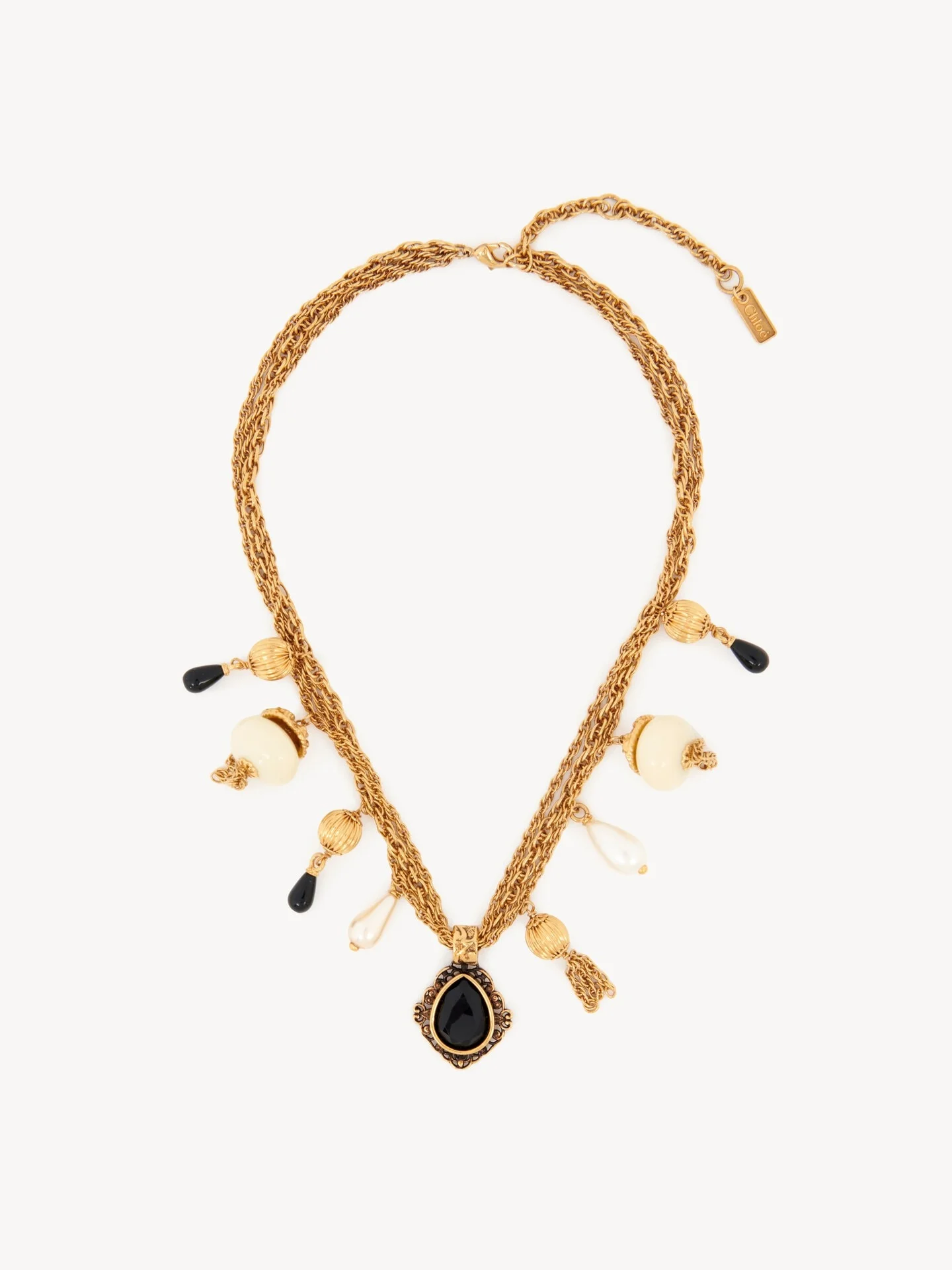DESCRIPTION Chloe Antique Pearls necklace in gold brass. Multiple chains of different sizes feature a variety of pendants with textured brass finishes, delicate chains, and black and white resin. The central pendant elevates an ornamental design with a black faceted teardrop. A gold-tone Chloe logo plate signs this piece. PRODUCT DETAILS Necklace in brass & resin - One size only - Adjustable - Metal Chloe logo plate Color: Gold & Black Item code: CH25AJN12BRS7ZG CARE INSTRUCTIONS To ensure this item's quality and longevity, wear it regularly and avoid exposure to direct sunlight and heat. Avoid impact, and contact with water, perfume or chlorine. Store your jewel in its pouch and box when not in use.