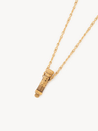 DESCRIPTION Chloe Elixir pendant necklace in vintage gold brass, featuring an ornamental tube vial set on an infinity chain. A Chloe logo engraving signs the pendant, while a gold-tone Chloe logo plate finishes the chain. PRODUCT DETAILS Pendant necklace in 100% brass - One size only - Adjustable - Metal Chloe logo plate - The cap opens to a small storage compartment Color: Vintage Gold Item code: CH25WJN07CB79DC CARE INSTRUCTIONS To ensure this item's quality and longevity, wear it regularly and avoid exposure to direct sunlight and heat. Avoid impact, and contact with water, perfume or chlorine. Store your jewel in its pouch and box when not in use.
