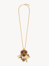 DESCRIPTION Chloe Heartfull pendant necklace in vintage gold brass, featuring a large, ornamental heart pendant embellished with inlaid burgundy resin. Multiple charms dangle from the heart, depicting vintage treasures in a variety of textures and materials. PRODUCT DETAILS Pendant necklace in brass, resin, glass pearl, crystal glass & tiger's eye - One size only - Adjustable - Metal Chloe logo plate Color: Burgundy Item code: CH25WJN16PST601 CARE INSTRUCTIONS To ensure this item's quality and longevity, wear it regularly and avoid exposure to direct sunlight and heat. Avoid impact, and contact with water, perfume or chlorine. Store your jewel in its pouch and box when not in use.